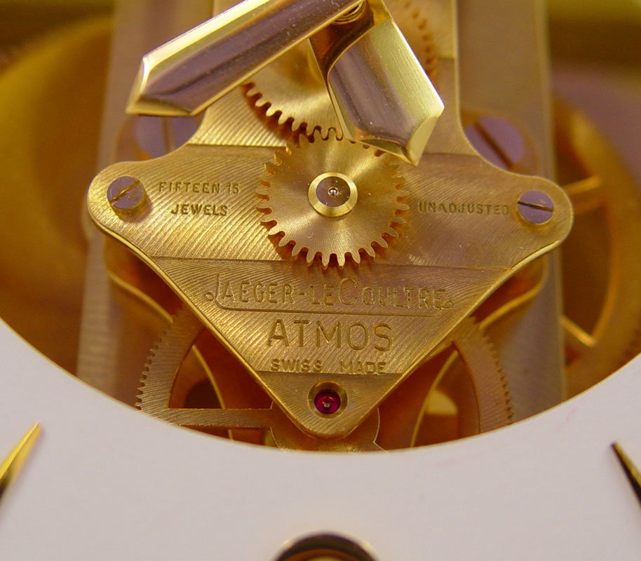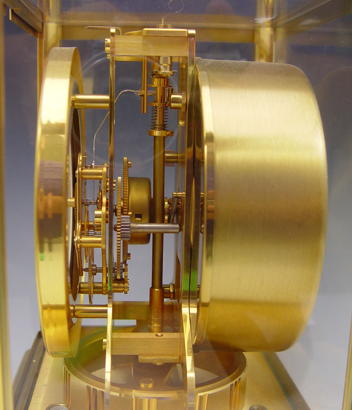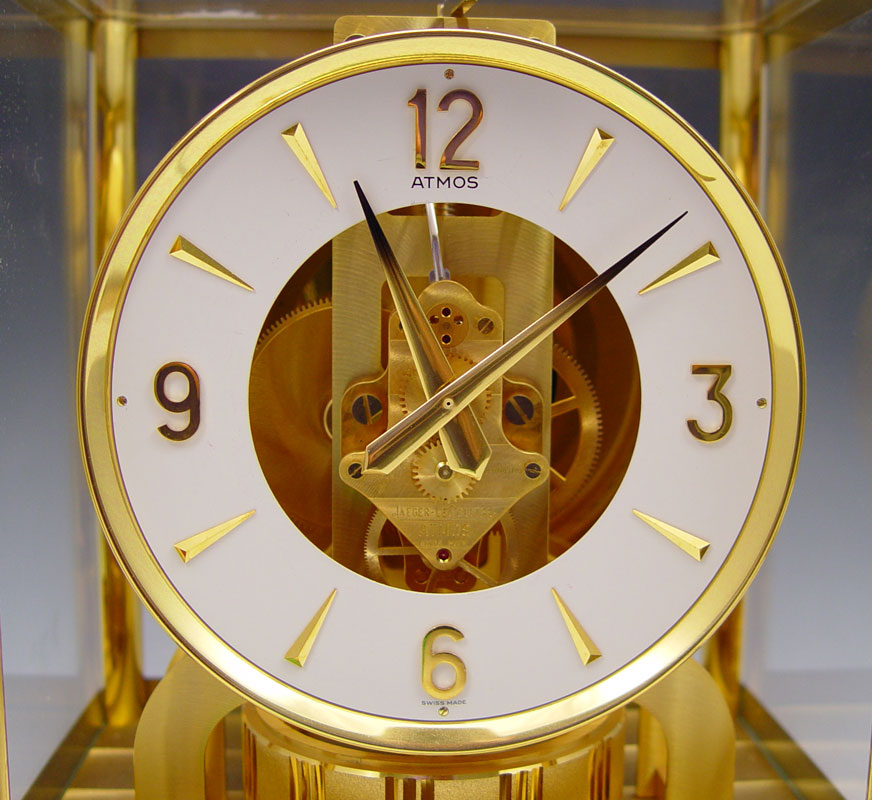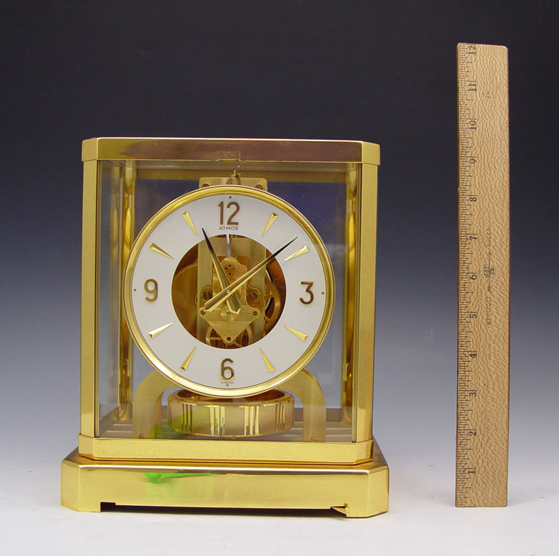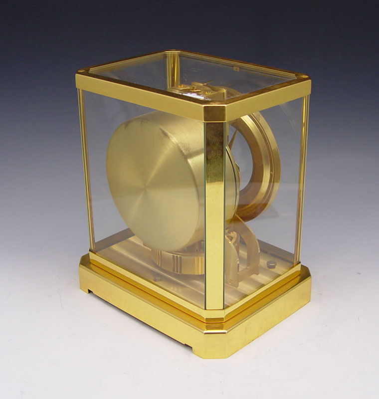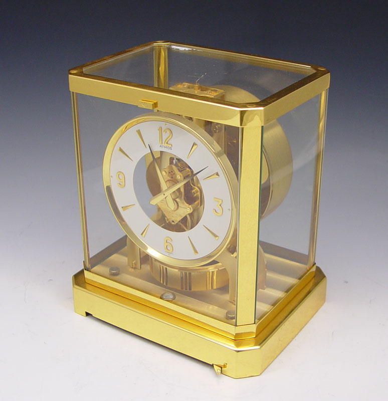 LE COULTRE ATMOS CLOCK: Circa 1979 by serial number date 498358. Brass case with glass sides and top. Marked Jaeger-Le Coultre Atmos Swiss made on movement. Measures 9 1/4'' h. x 8 1/4'' x 6 3/4''.