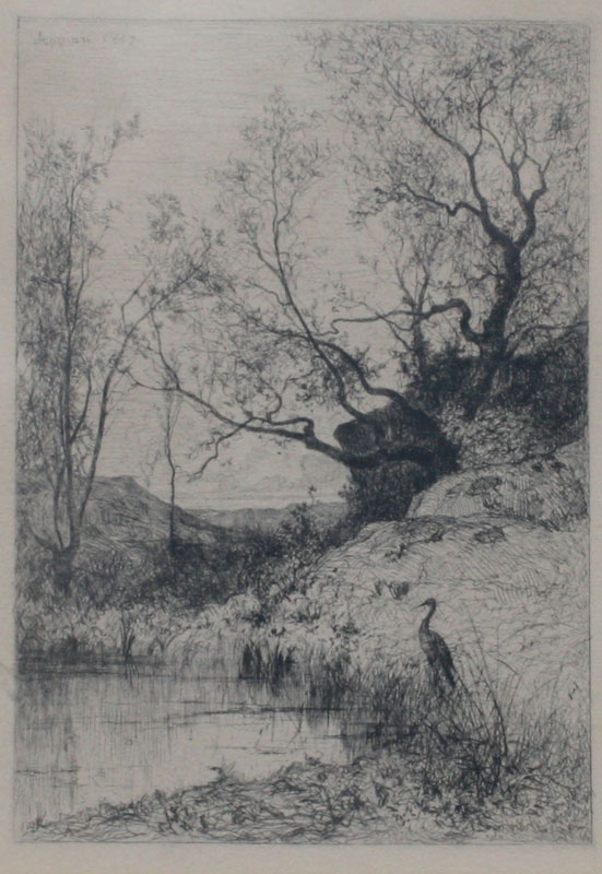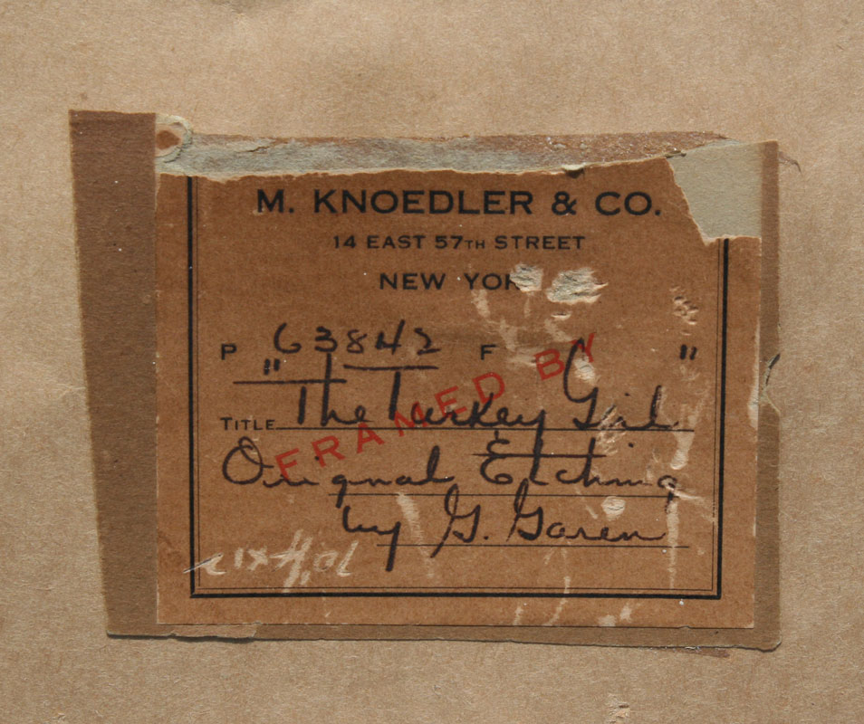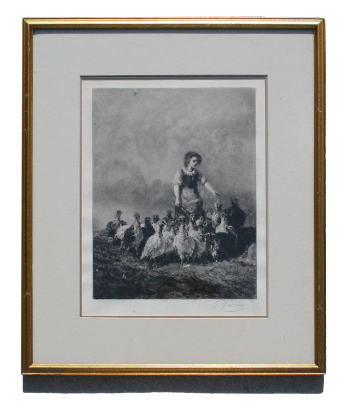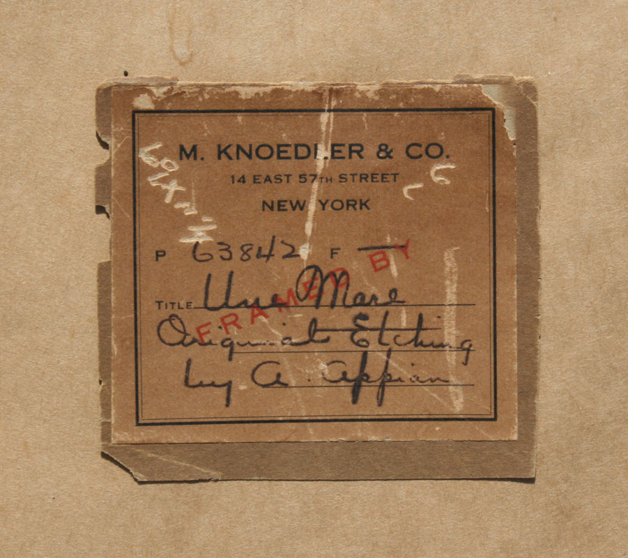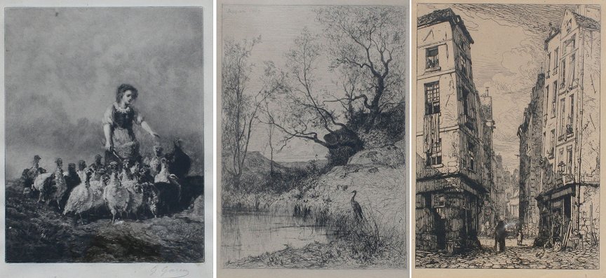 3 PIECE COLLECTION OF ETCHINGS: To include MASIME, Lalanne, (): Place Pigalle, Etching, sight size 10 1/2'' x 7 1/2'', framed, 17'' x 13 1/2''. GAREN, G., (): Turkey Girl, Etching, sight size 12'' x 9 1/4'', pencil signed, framed, 18 1/4'' x 15 1/2''. Original Etching by APPIAN, A., (): ''Une Mare'', Etching, sight size 10'' x 7'', signed in the plate and dated 1867. All bear the Knoedler Gallery label verso.