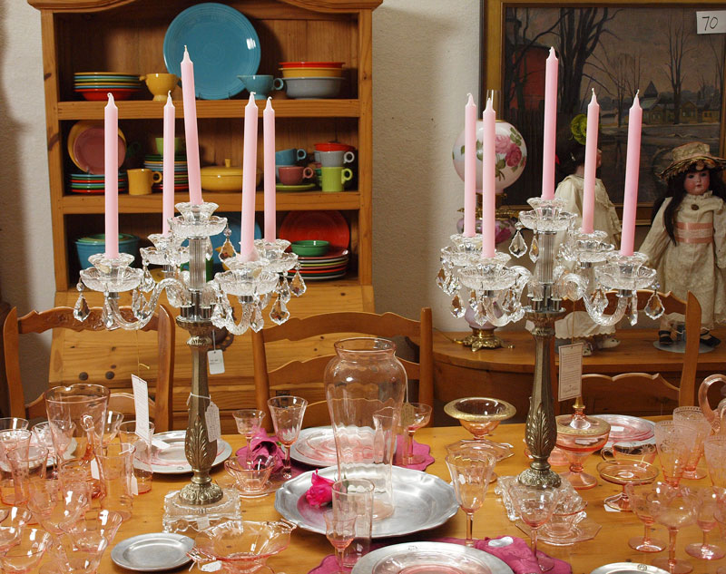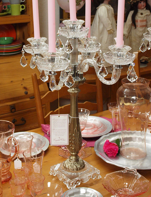 PAIR 5 LIGHT CRYSTAL CANDELABRA: Cast metal body, made in Poland for Crystal Clear. 24'' h. x 17 3/4''. New with tag.