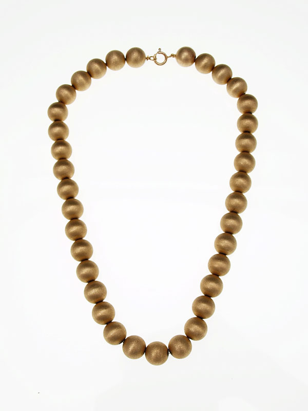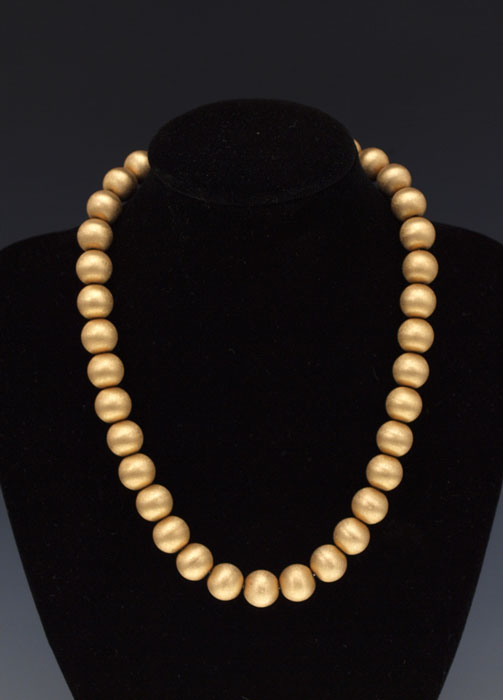 14K GOLD BEAD NECKLACE: 36 - 11mm beads of brushed yellow gold on gold chain, 15 1/2''l., 39.2 grams.
