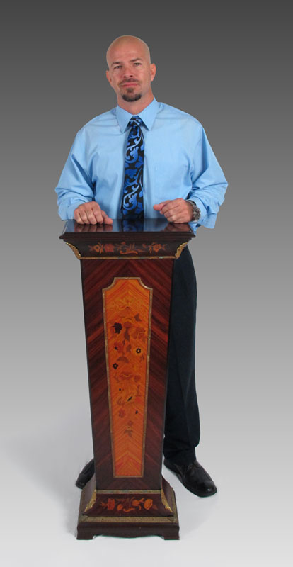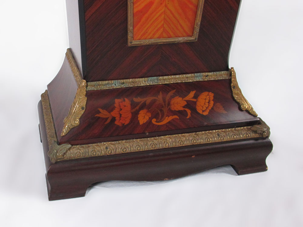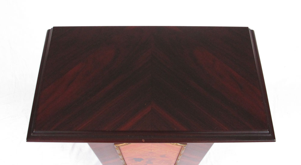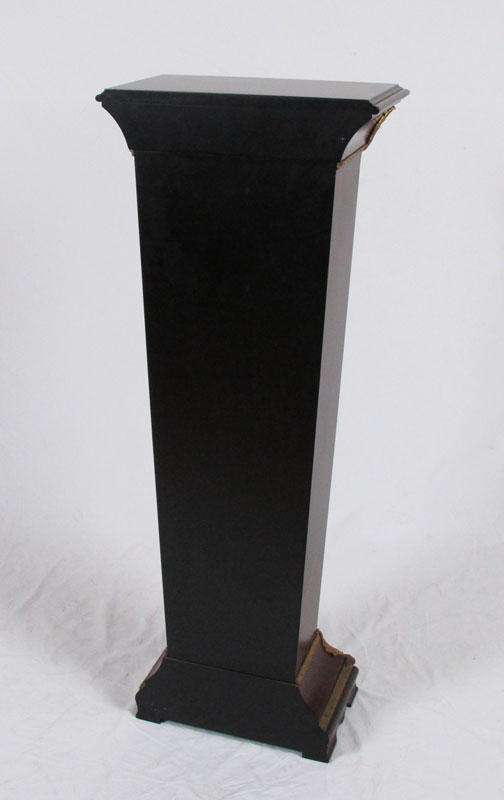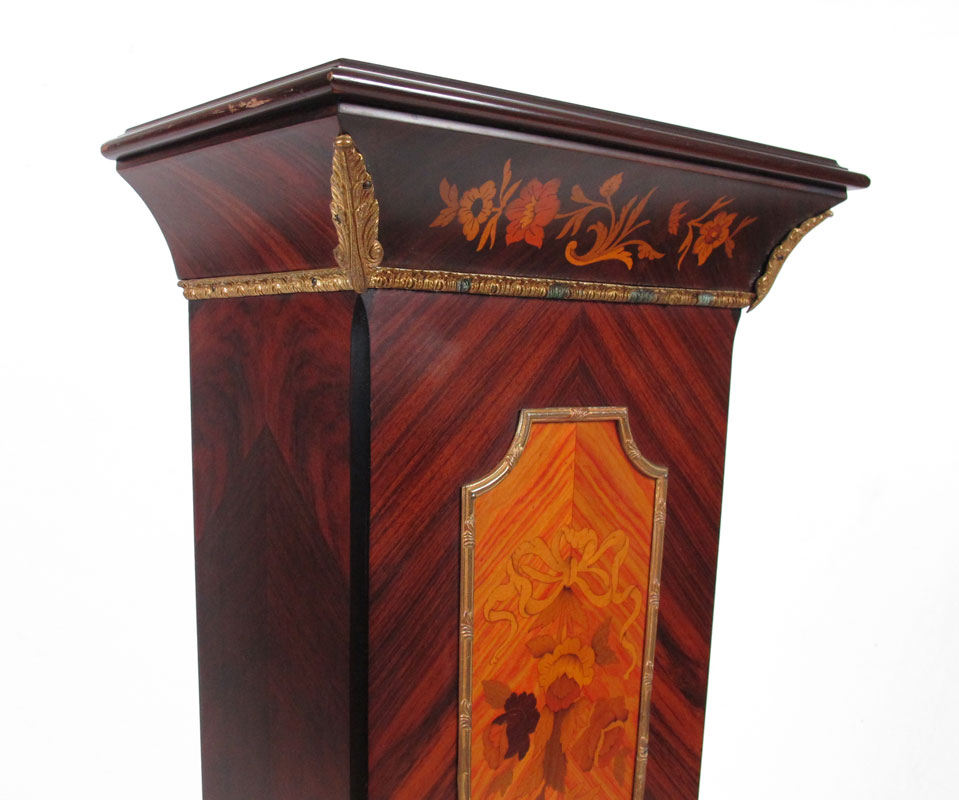 MARQUETRY INLAY PEDESTAL: Floral garland and ribbon designs. Gilded metal accents. Modern production. 45'' h x 17'' x 9 1/2''.