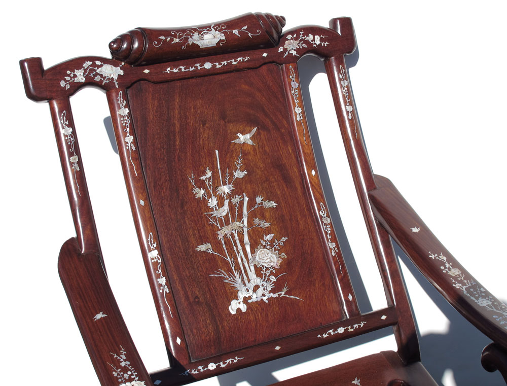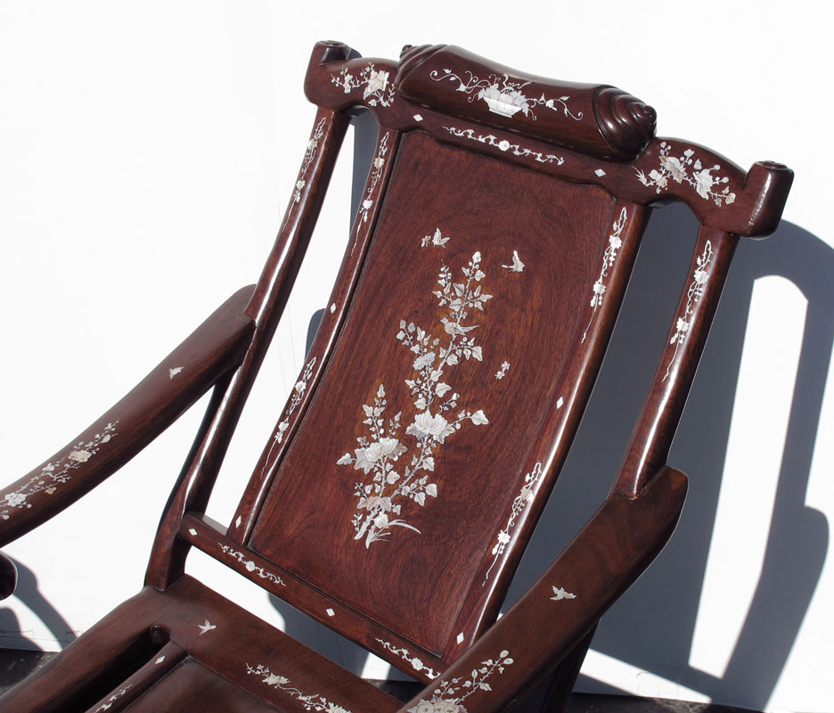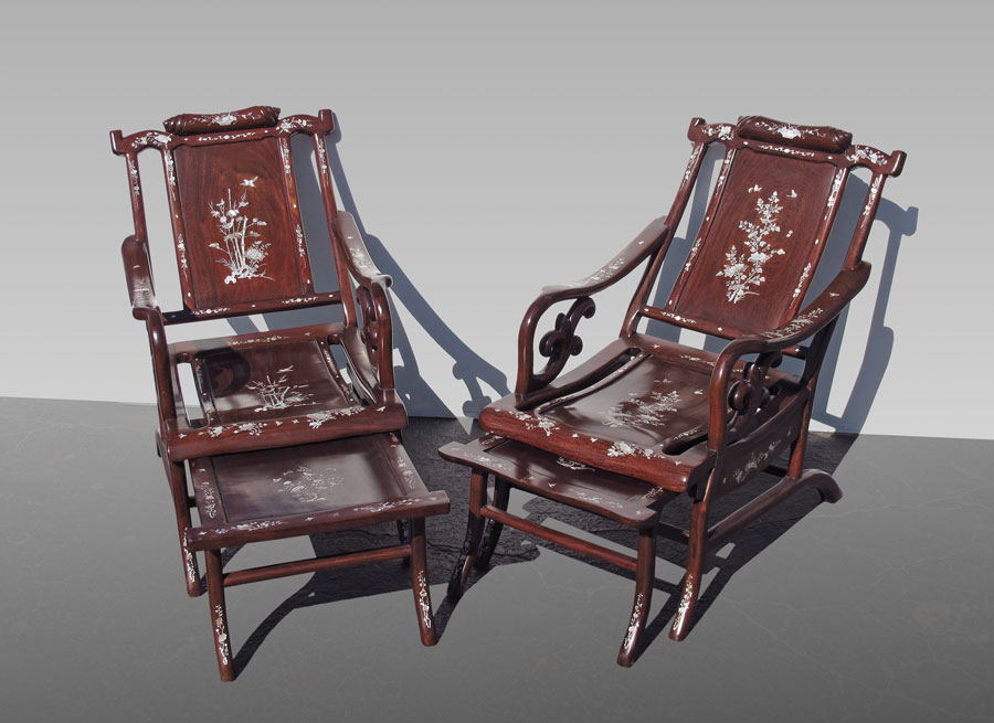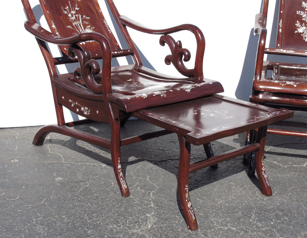 PAIR ASIAN MOTHER OF PEARL INLAY LOUNGE CHAIRS: Rosewood with carved pillow back and arms. Fine detailed inlay throughout. Adjustable pullout lounge extension. 34 1/2'' h. x 22 1/2'' x 36'' closed.