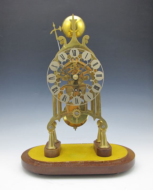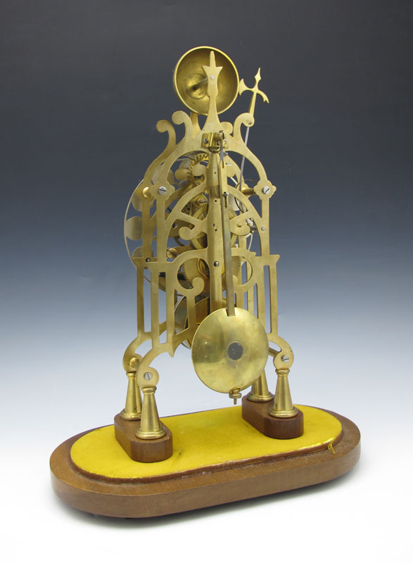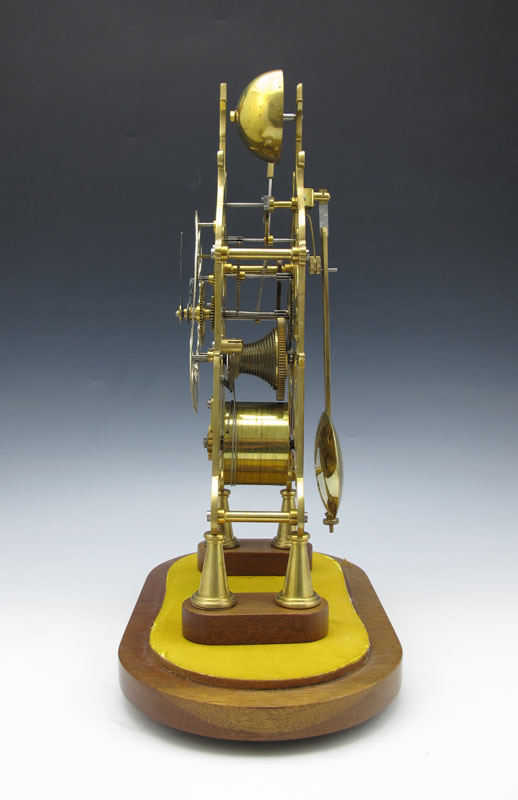 BRASS SKELETON CLOCK UNDER GLASS DOME: Late 19th to early 20th century with unsigned fusee passing strike movement, under glass dome. Original pendulum. Clock measures 13 1/2'' x 6'' x 2 3/4''. Overall with dome and base 17'' x 11'' x 6 1/2''.