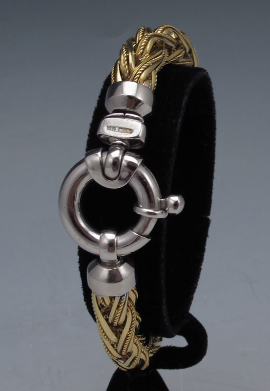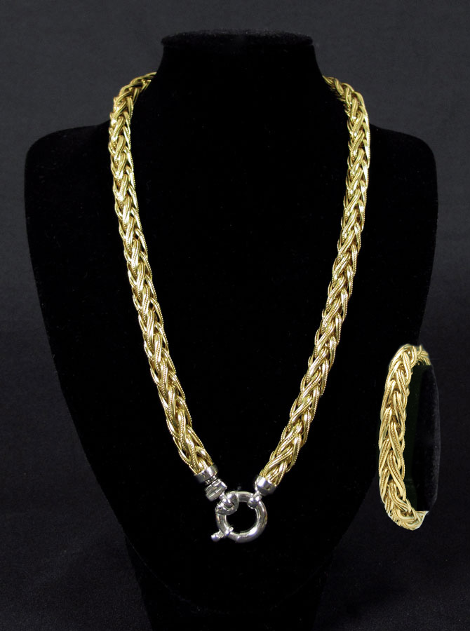 14K INTERWOVEN FANCY LINK NECKLACE & BRACELET: 14K yellow gold fancy link with white gold giant spring ring closures. Necklace - Length: 19 1/2'' Weight: 60.8 grams. Matching bracelet - Length: 8'' Weight: 28.7 grams.
