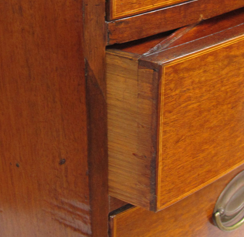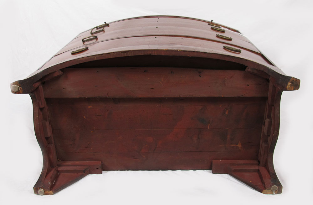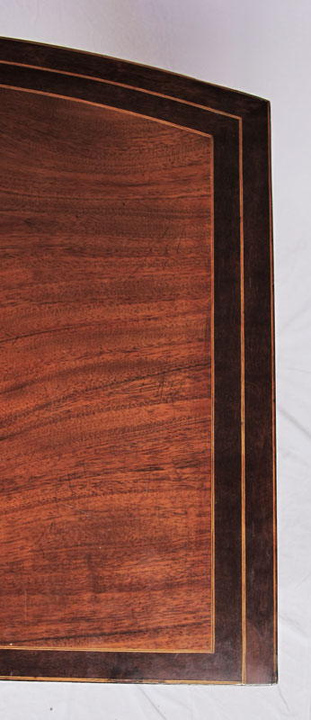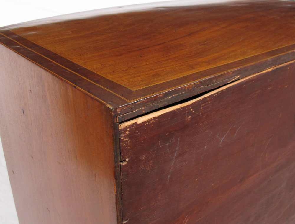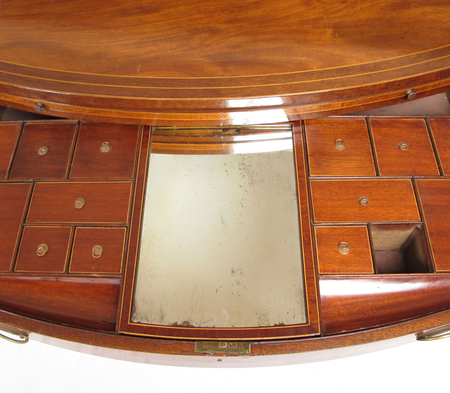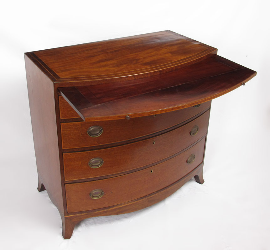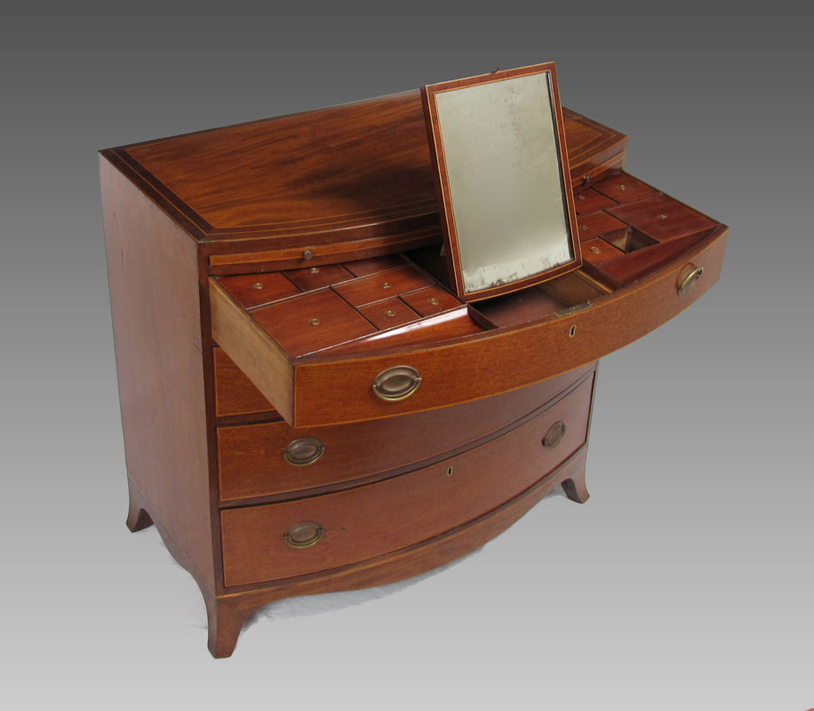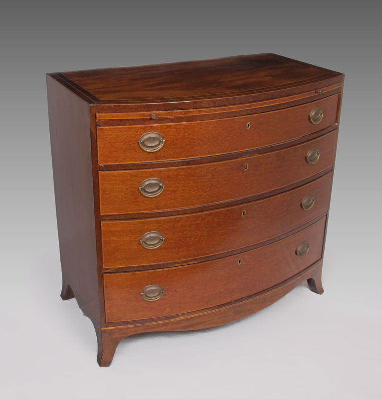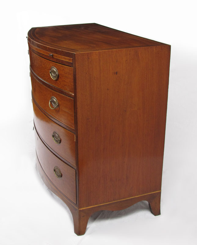 GEORGE III STYLE BACHELORS CHEST: George III style mahogany bow front chest of drawers. Bowed top over body of conforming shape fitted with brushing slide and four long graduated drawers, raised on scalloped skirt with splayed feet. Top drawer with fitted interior and mirror. String inlay with minor loss. Approx. 38'' tall x 22.5'' x 39'' wide.