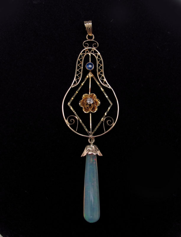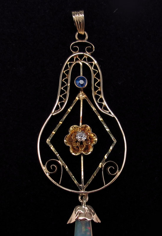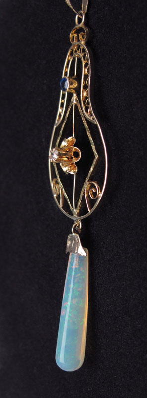 14K GOLD DIAMOND SAPPHIRE AND OPAL DROP PENDANT: Delicate gold work. 2 1/2''l
