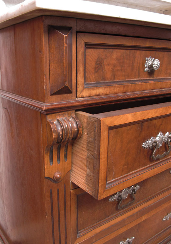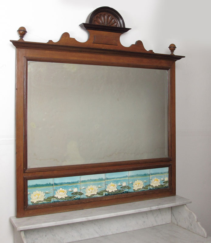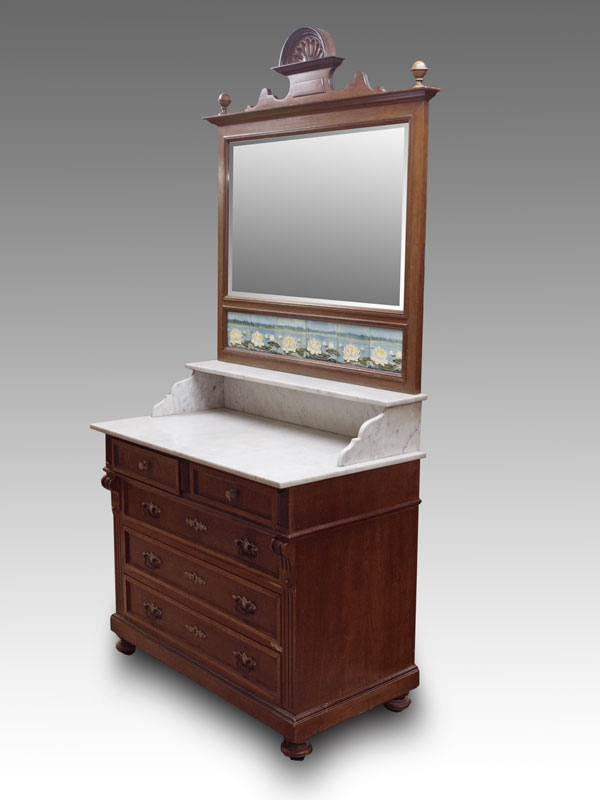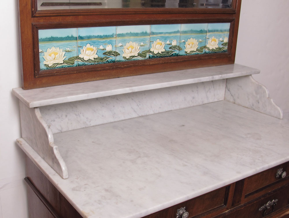 TILE BACK DRESSER WITH MIRROR: 2 drawer over 3 drawer with marble top with marble shelf. Mirror with water lily tile backsplash. 85 1/2'' h. x 41 1/4'' x 22 1/2''.