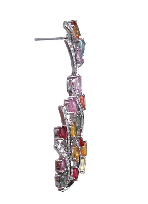 18K WHITE GOLD AND MULTI COLOR SAPPHIRE EARRINGS: 18K white gold drop earrings contain 118 brilliant cut diamonds, total weight approx. 1.5 Ct., averaging VS in clarity and G-H color. The approx. 6 Ct of sapphires average VS in clarity. Diamonds and sapphires are prong set. Post and nut closures. 2'' length. Weight 18.9 grams. Sold with current Florida Diamond Appraisers GIA graduates appraisal for $6,250.