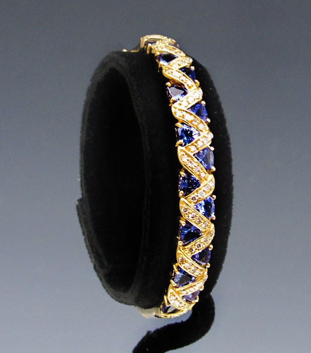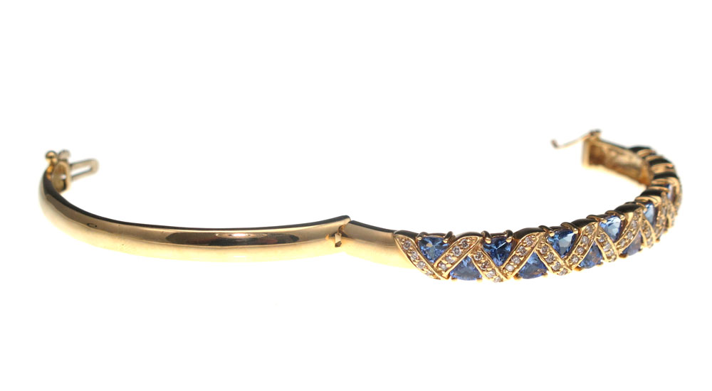 14K DIAMOND AND TANZANITE BANGLE BRACELET: 14K yellow gold bangle bracelet contains sixty four round brilliant cut diamonds. WEIGHT: .80 Ct. Approx. Rated SI in clarity and H-I in color. Fifteen triangle mixed cut tanzanite. WEIGHT: 3.00 Ct. Approx. Rated VVS in clarity (Type I), bV in hue, 3-4in Tone and 3-4 in Saturation. The diamonds and tanzanite are prong set. Hinged bangle with figure eight safety clasp. Weight: 16.1 grams.