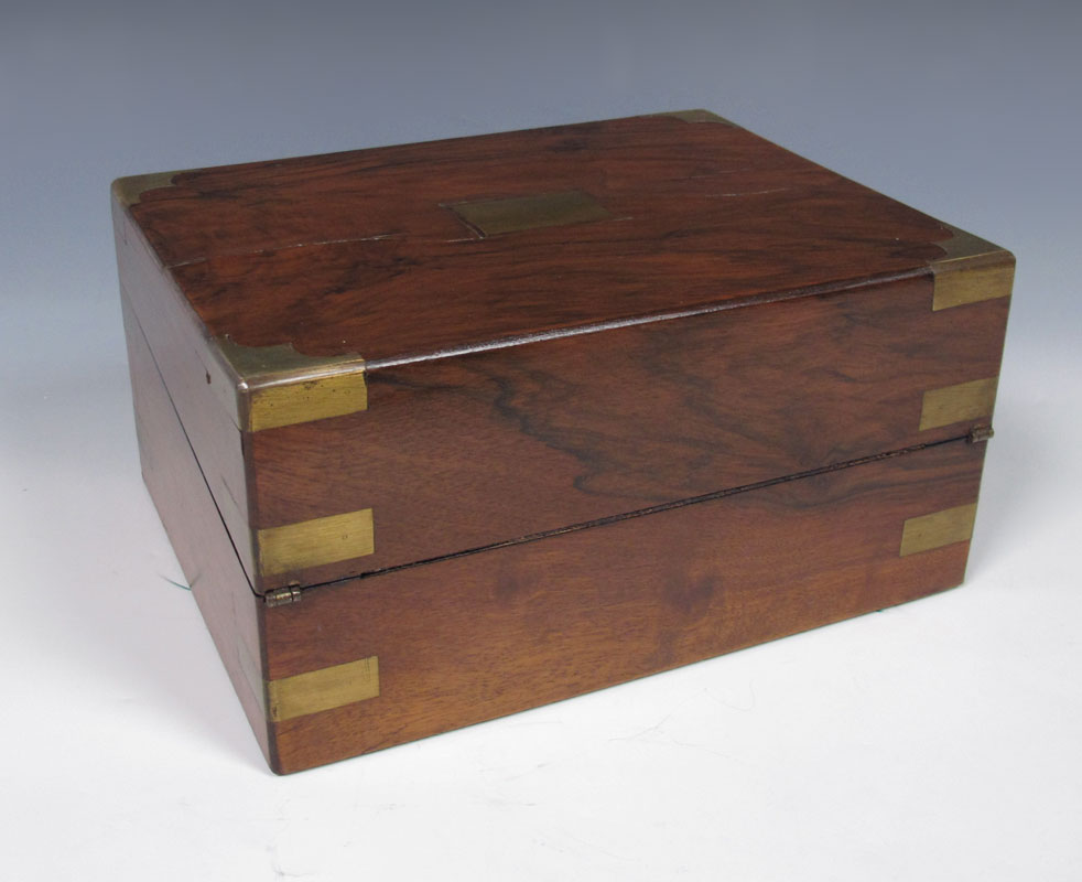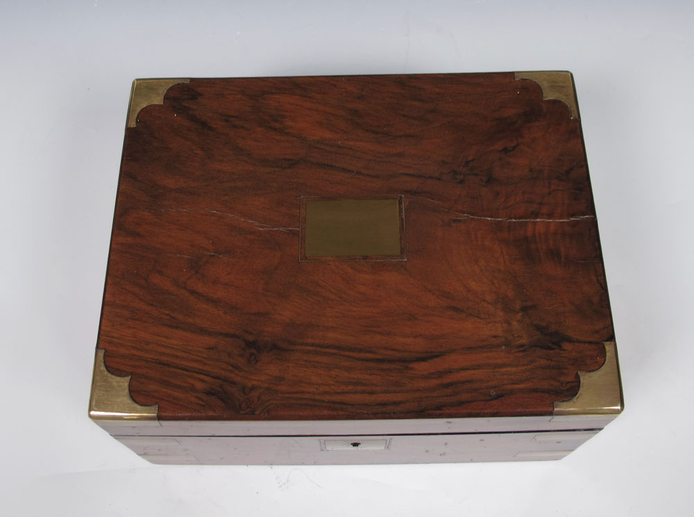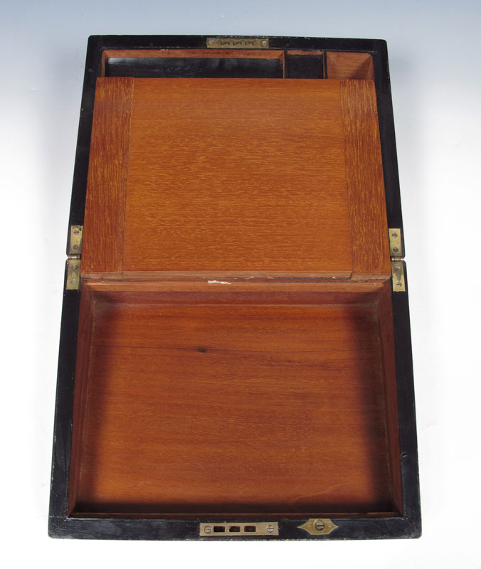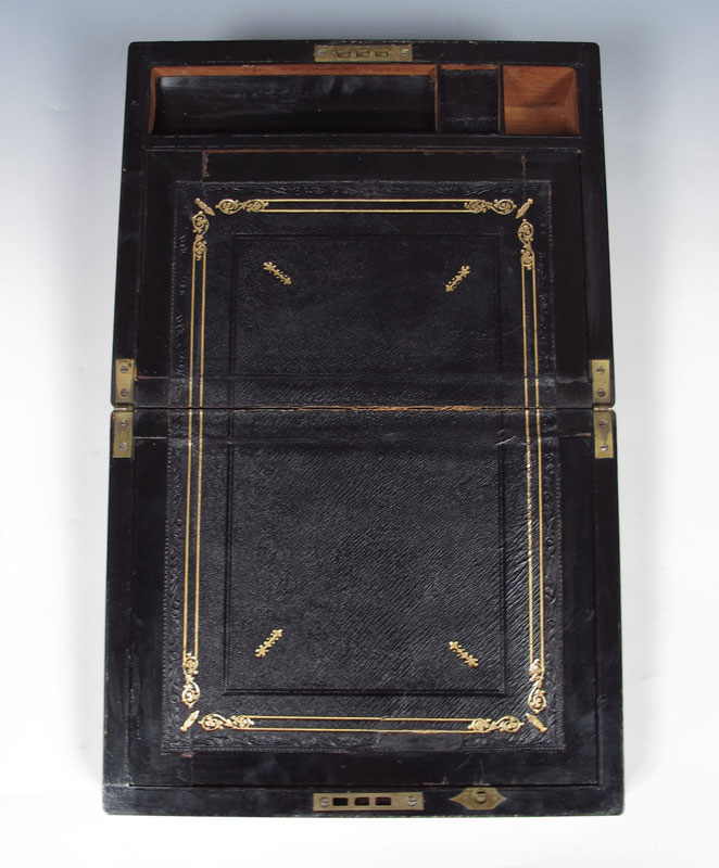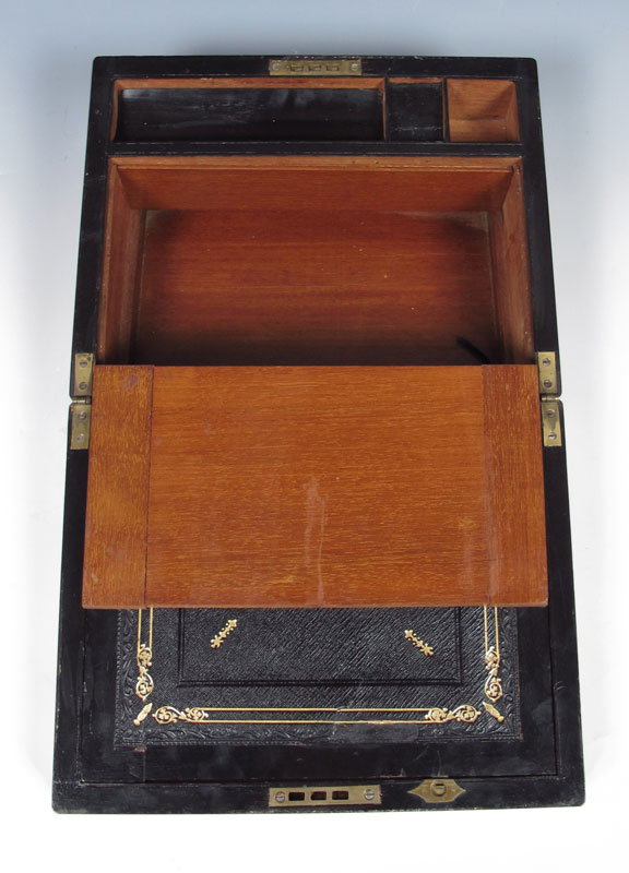 19TH C. BRASS INLAY ROSEWOOD LAP DESK: Hinged box, the interior with gold embossed black leather, pen tray and ink bottle. 6'' x 9'' x 12 3/4''.