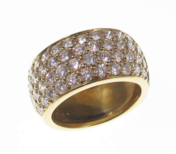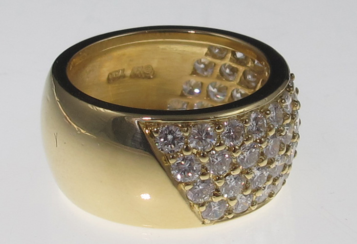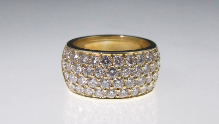 KURT WAYNE 18K DIAMOND HEIRLOOM BAND: Pave encrusted wide band of 18k yellow gold, 48 round brilliant cut diamonds, 2.40 ctw approx., VS clarity, GH color, size 5.5, 8.7 grams. Sold with current Florida Diamond Appraisers GIA appraisal, $6250 retail replacement value.