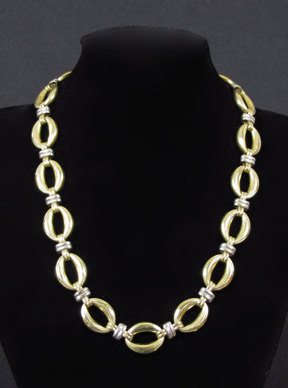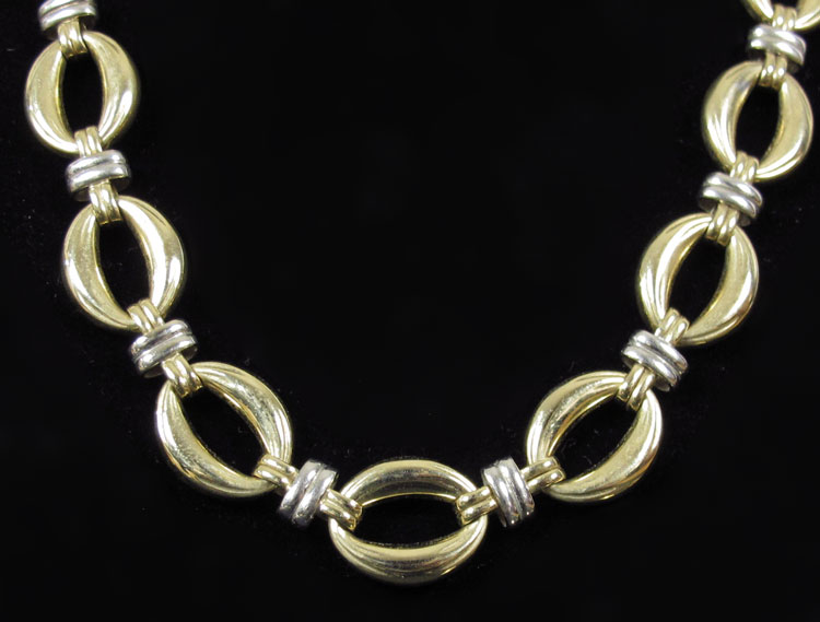 14K LINK NECKLACE: 14K yellow with white gold link necklace. Oval links. Locking closure with two figure eight safety clasps. Sold with the Gucci box. Weight: 49.2 grams.