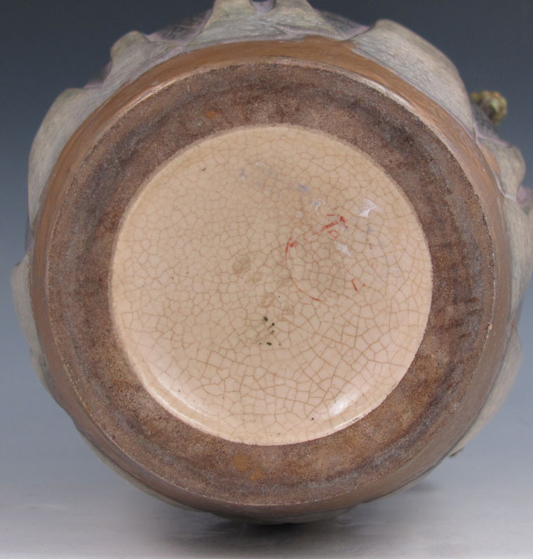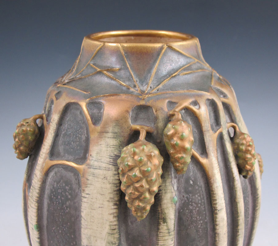 PAUL DASCHEL TEPLITZ AMPHORA VASE: Stylized pine trees with applied pinecones. #2088. Partial red Teplitz stamp. 9'' h. x 6 1/2''.