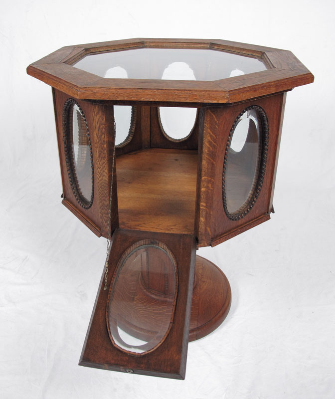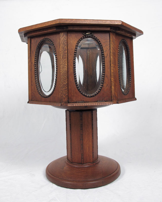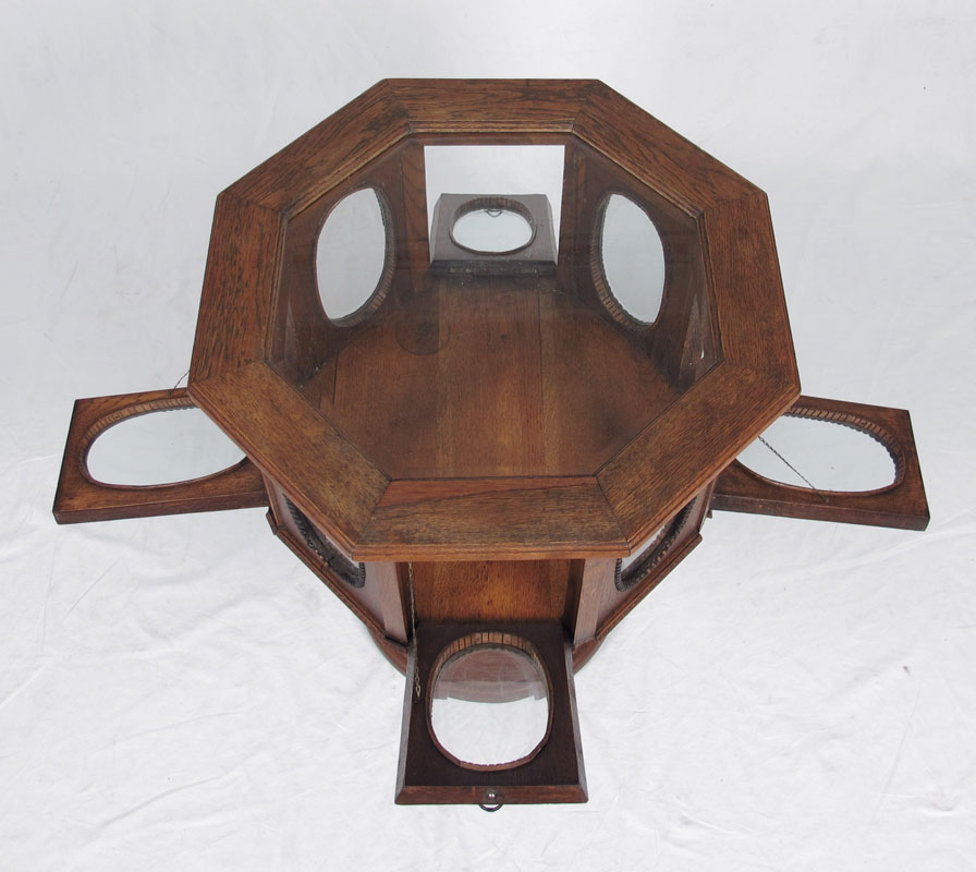 OCTAGONAL VICTORIAN OAK VITRINE: Octagon shaped vitrine with glass top and oval beveled glass on side panels. 4 drop down doors on every other side panel. Pedestal base on round stand. 24'' wide, 24'' deep, 28 1/2'' tall.