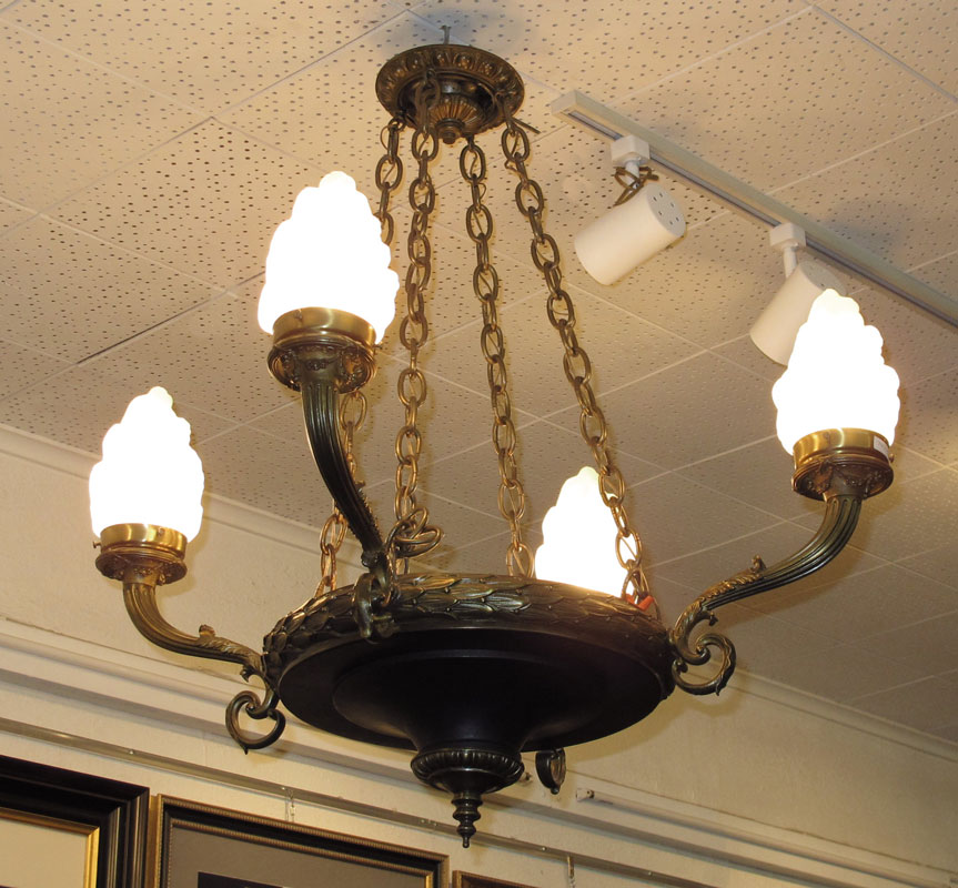 VICTORIAN 4 LIGHT CHANDELIER: Patinated white metal with 4 satin flame shades. Measures 33 1/2'' h. including chain x 33''.