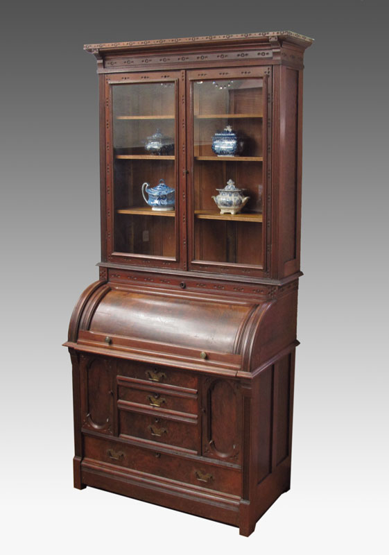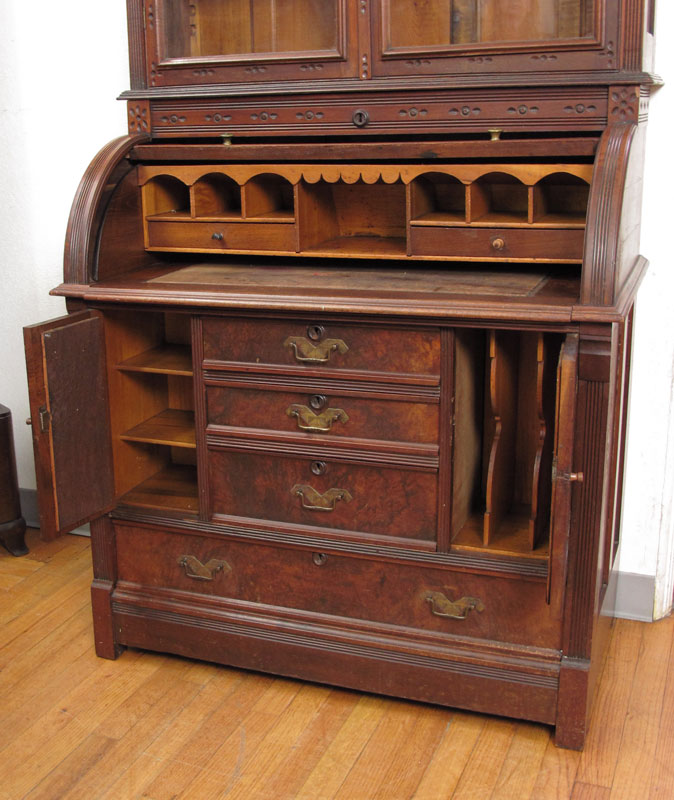 VICTORIAN ERA CYLINDER ROLL SECRETARY BOOKCASE: Spoon carved case, bookcase over slide out leather top desk. Unusual lower configuration of 3 central drawers between doors, full length bottom drawer. Approx. 7 ft. tall x 38 1/2'' x 22'' deep.