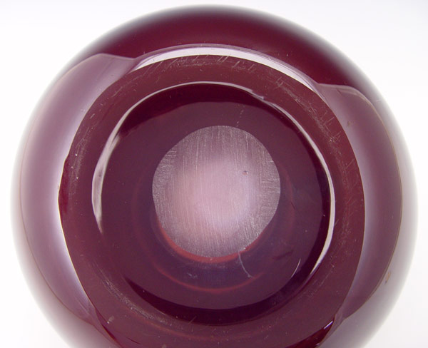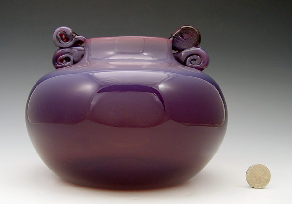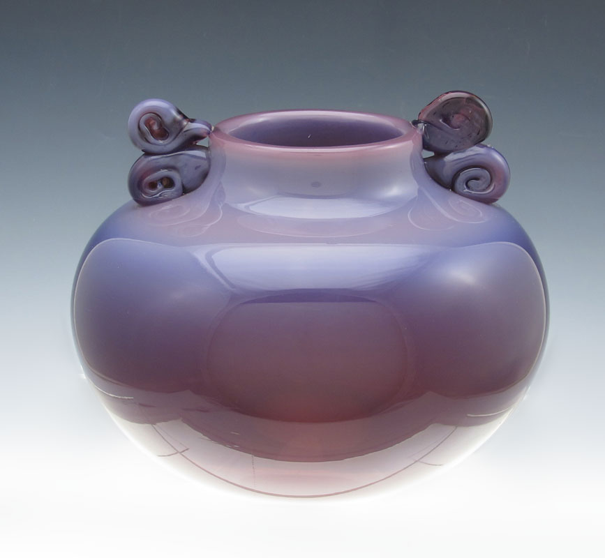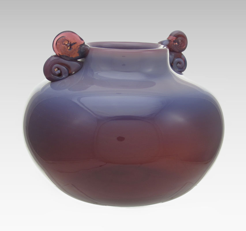 OPALESCENT ART GLASS VASE: Opalescent plum fades to a rich dark purple hue, 6'' tall x 8'' dia. Unsigned.