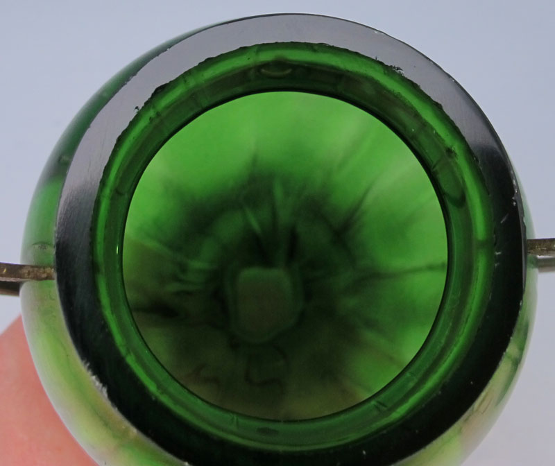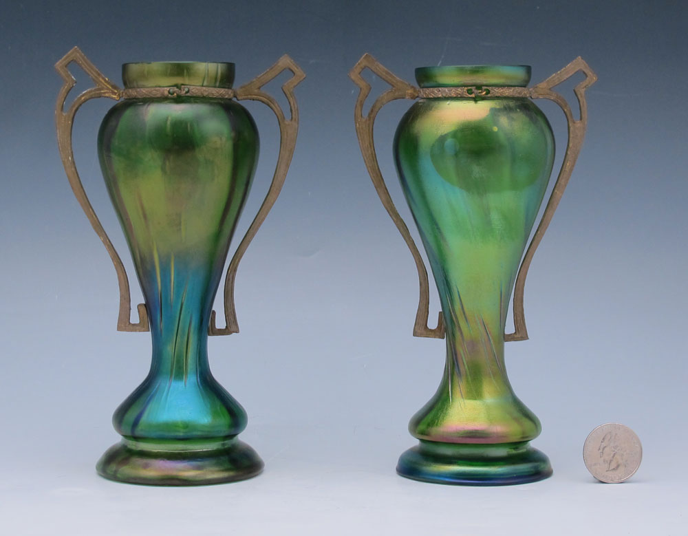 PAIR OF BOHEMIAN ART NOUVEAU IRIDESCENT GLASS VASES: Metal mounted vases attributed to Loetz or Rindskopf. Approx. 6 3/4''h.
