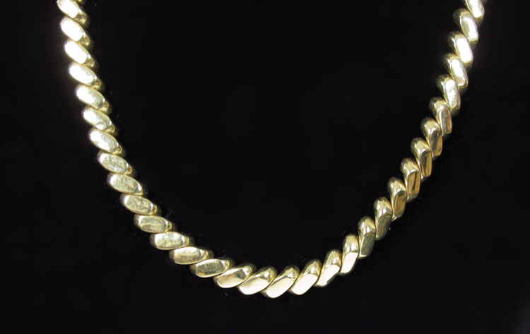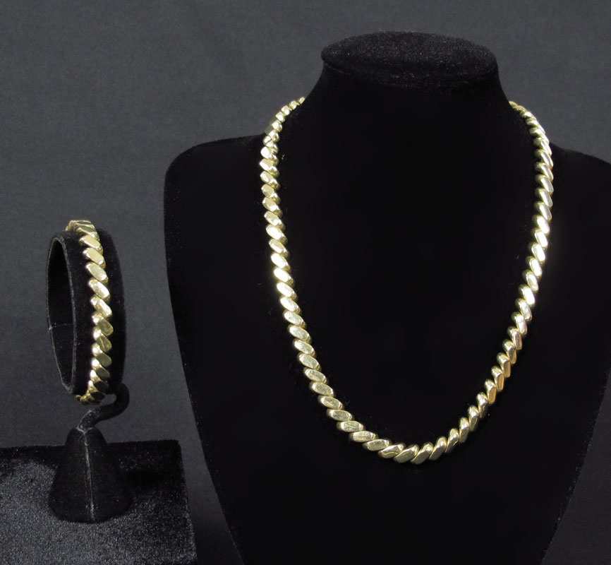 14K FANCY LINK NECKLACE/BRACELET SET: 14K yellow gold necklace and bracelet set. Fancy Link. Locking closures with figure eight safety clasps. Necklace Length: 16'' bracelet Length: 7 1/4 '' Weight: 47.5 grams.