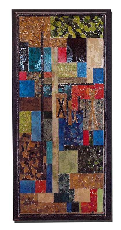 MOSAIC GLASS COLLAGE WALL HANGING: Geometric design assorted glass pieces mounted to board. Unsigned. Frame 43'' x 19 1/2''.