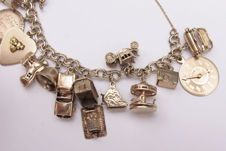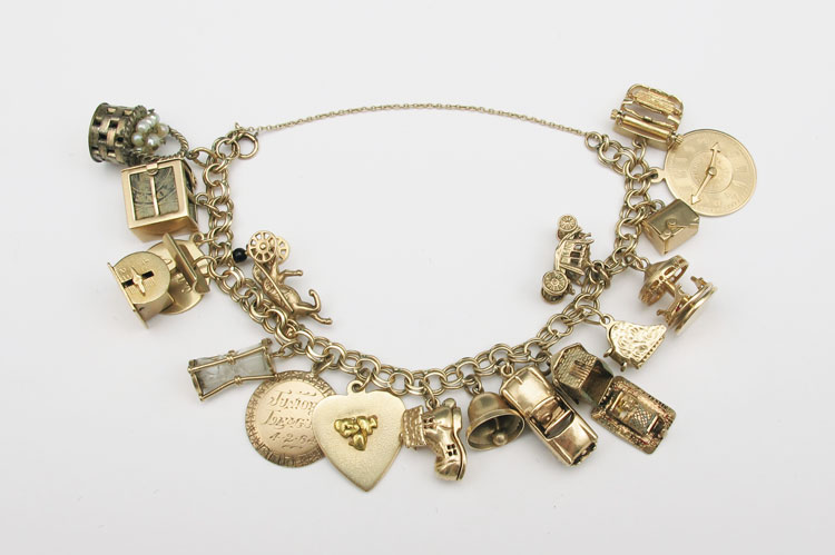 A MOST CHARMING 14K GOLD CHARM BRACELET: 14K charm bracelet with seventeen 14K charms, several articulated. One non-gold charm. Length: 6'' Weight: 65.4 grams.