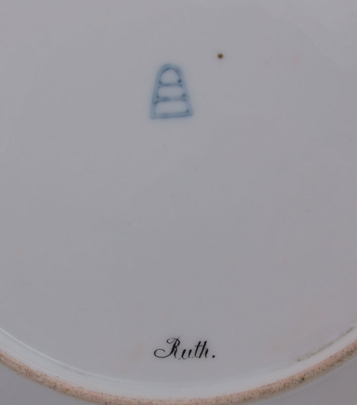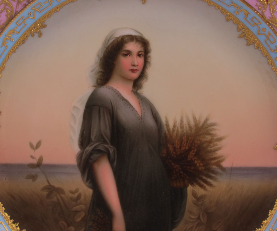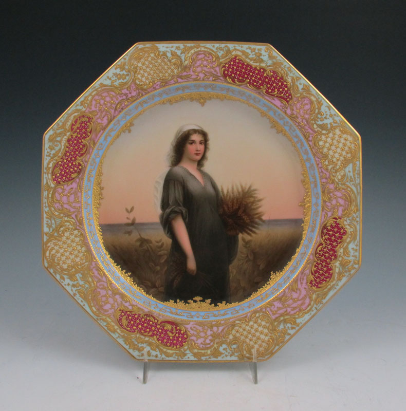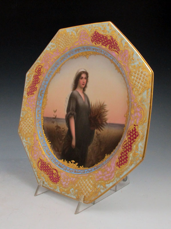 ROYAL VIENNA CABINET PLATE: After Charles Z. Landelle, hand painted image of Ruth. Signed Preller. Blue beehive mark under glaze. Octagonal shape with heavy gilt embellishment. 9 1/2'' dia.