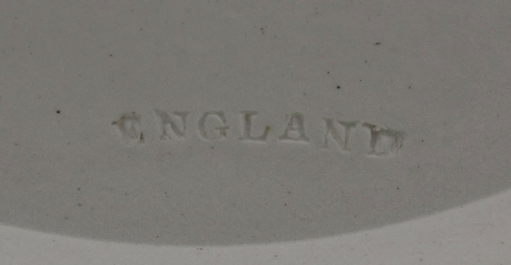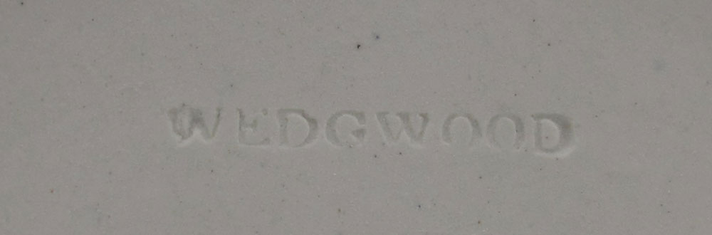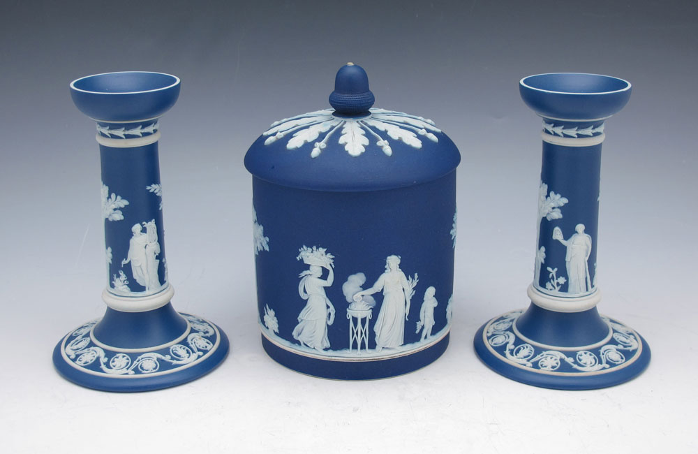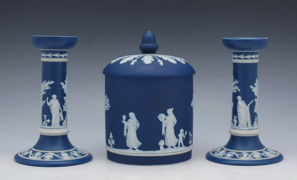 WEDGWOOD JASPERWARE BISCUIT JAR AND CANDLE STICKS: Dark blue in classic Grecian design. Biscuit jar has an acorn finial, measures 6'' tall. The candles measure approx. 6''. All pieces impressed ''Wedgwood'' and ''England''.