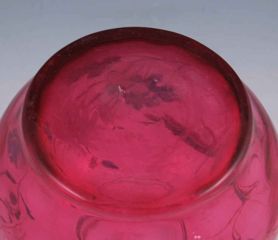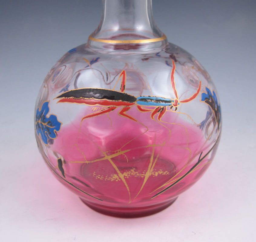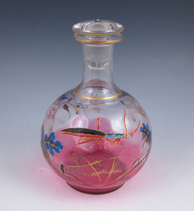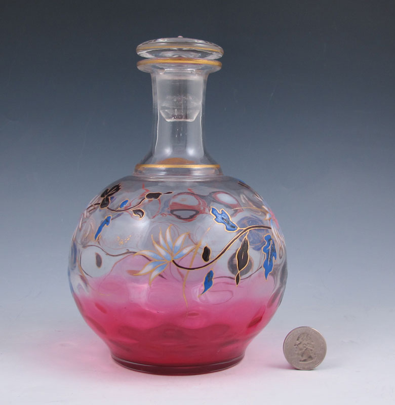 MOSER QUALITY ENAMELED DECANTER: Cranberry fade to clear, 7 1/2'' h.