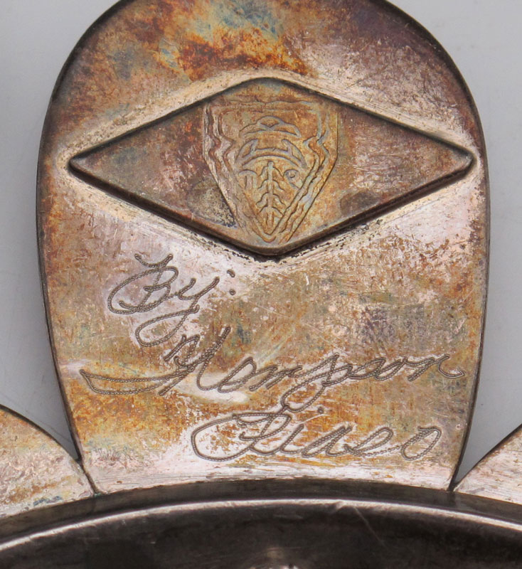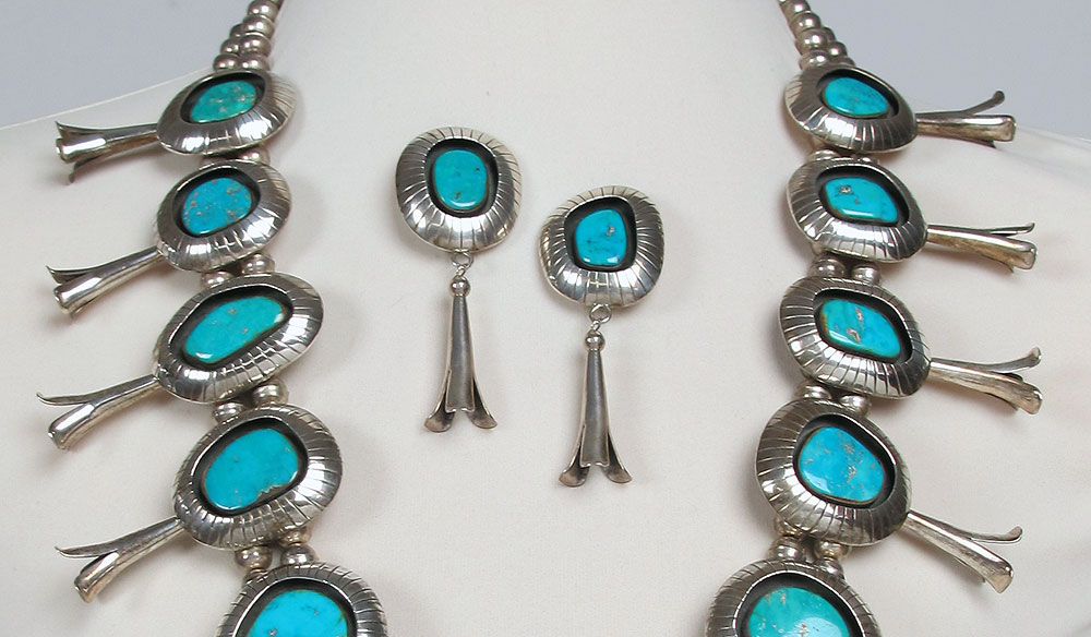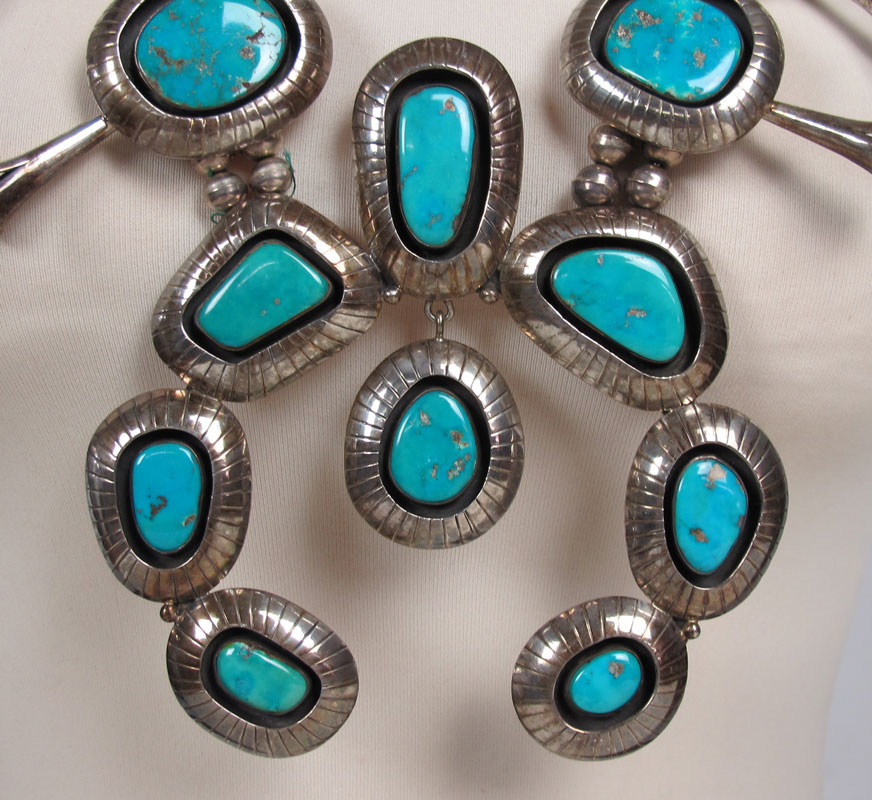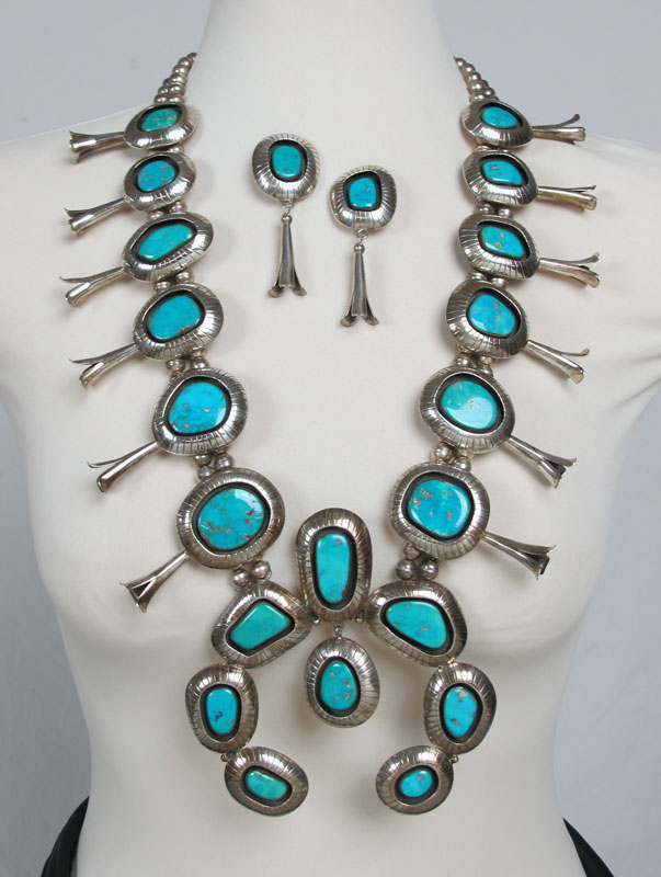 STERLING SILVER & TURQUOISE SQUASH BLOSSOM NECKLACE & EARRINGS BY THOMPSON PIASO: Over sized squash blossom necklace with a full dozen shadowbox blossoms, graduated in size approx. 1 7/8'' x 2 1/2'' to 1 1/4'' x 2 1/4'' and large naja with center dangle 4 3/4'' x 4 3/4'', approx. 30''l. Matching shadowbox blossom clip back earrings, approx. 3''l. Approx. 15 troy oz with stones. From the Audrey Meadow estate auction, C.B. Charles Galleries January 1997, Lot 363, with original catalog.