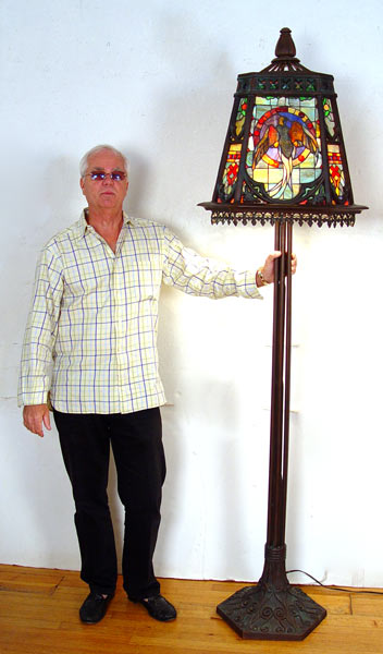 7 FT TALL LEADED GLASS TORCHIERE FLOOR LAMP: 6 light with slag glass shade depicting birds (Parrots). See next lot 188 for match. Approx. 87''h. overall, shade 24'' square