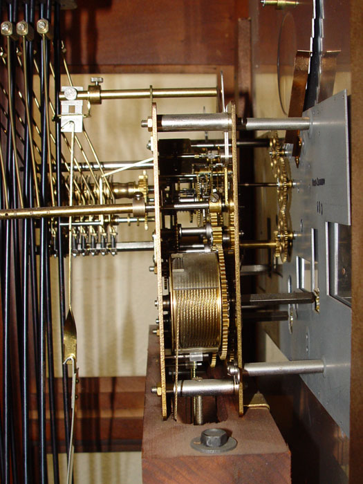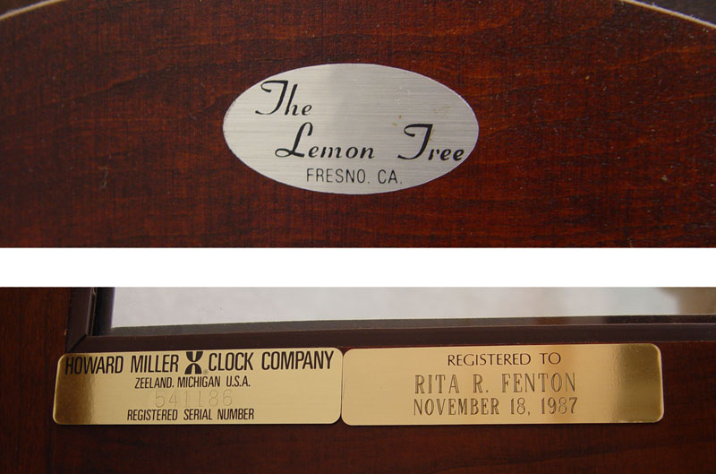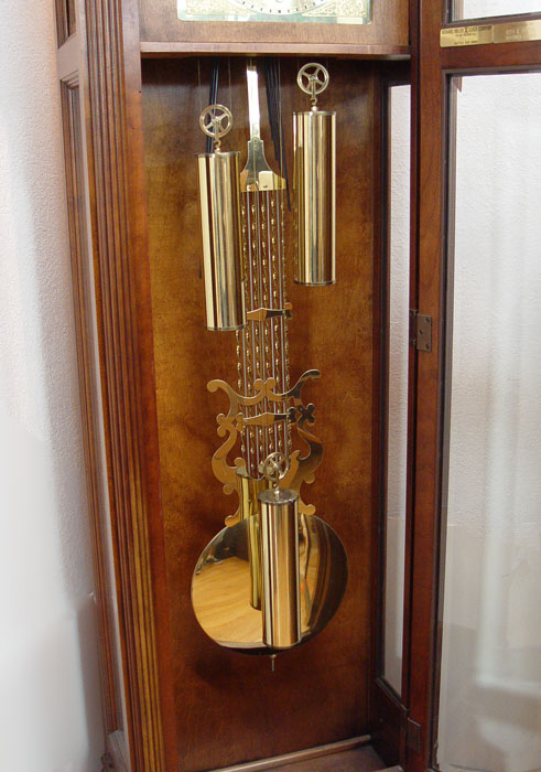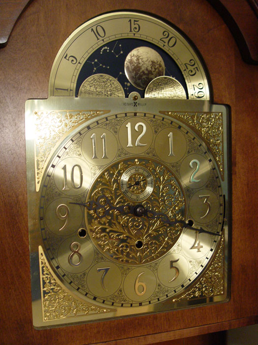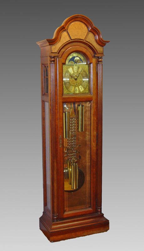 HOWARD MILLER MOONPHASE GRANDFATHER CLOCK: Moonphase with secondary dial. 4 chimes plus silent. Case has applied fluted half columns and burl accents at top. Pendulum and weights have original boxes. 82'' h. x 24 1/4'' x 12 3/4''