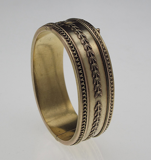14K GOLD VICTORIAN BANGLE BRACELET: 14K yellow gold Victorian bangle bracelet. Hinged with locking closure and safety chain. 3/4'' in width. 2 1/4'' diameter. Weight: 33.0 grams.