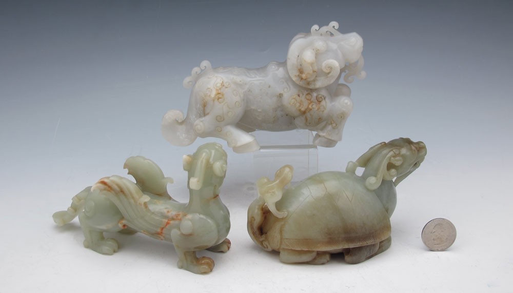 3 CHINESE HARD STONE FIGURAL CARVINGS: Nephrite dragon and mythical beasts. Approx. 5 1/2''l. x 3 1/2'' tall.