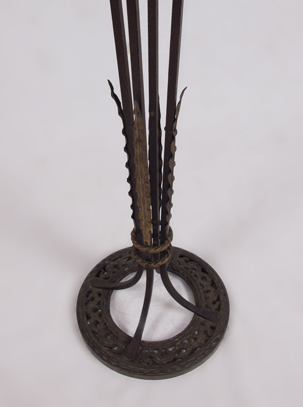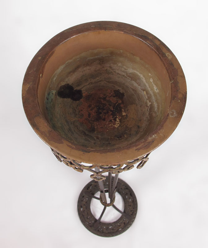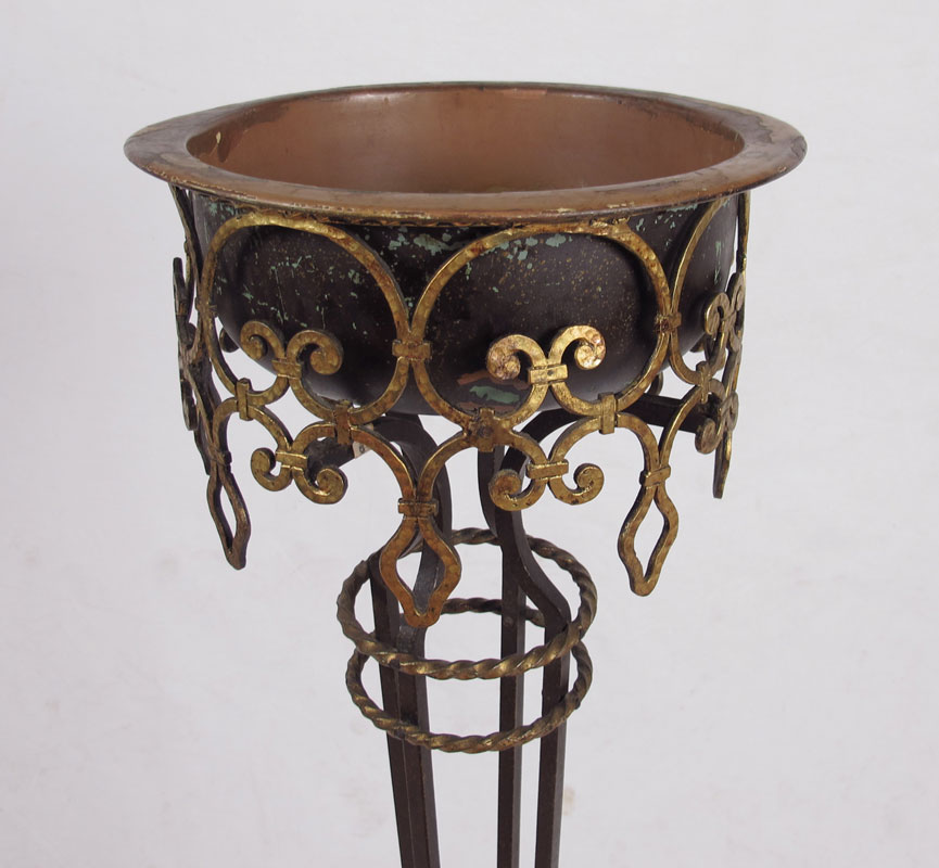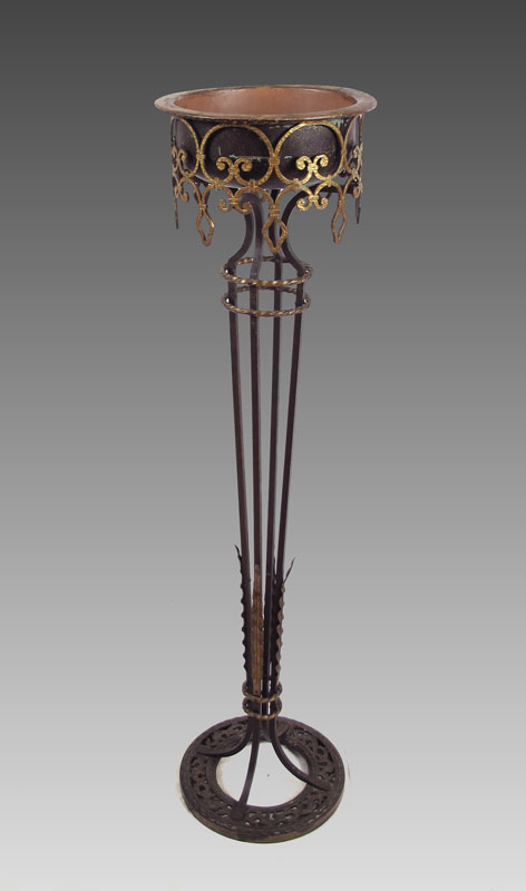 OSCAR BACH ERA IRON FERN STAND: Scrolled and gilt iron stand, copper insert, 43'' tall, 11'' dia.