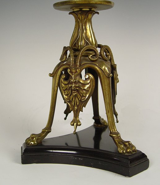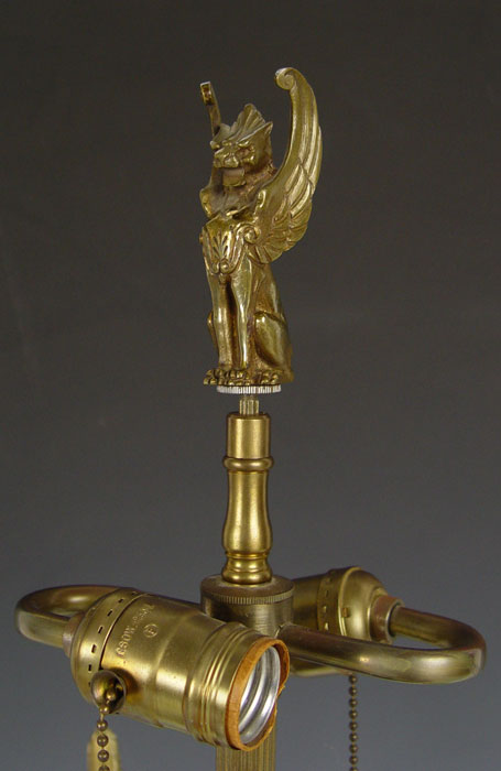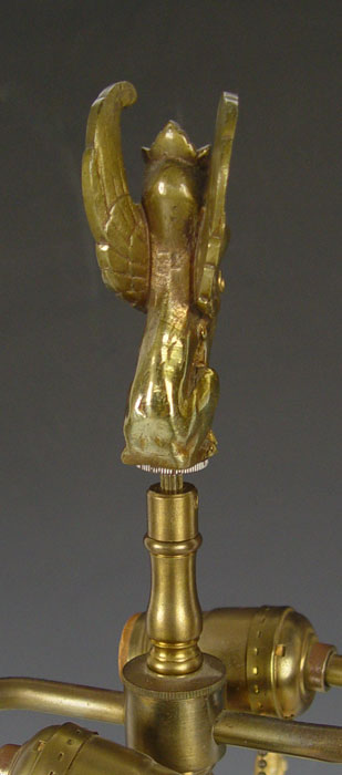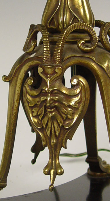 BRONZE TABLE TOP CANDELABRA LAMP: Tri legged paw foot base with horned masquerons, five arm candle holder centered by an electric lamp, winged griffin finial, 36''h., approx. 14'' dia. arm to arm.
