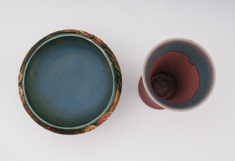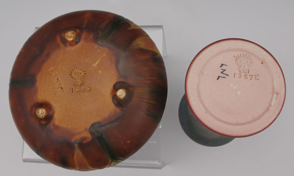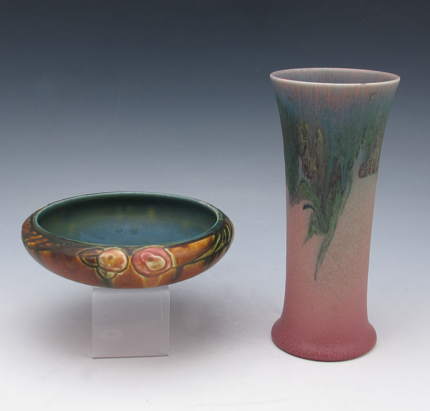 2 PC ROOKWOOD POTTERY VASE LOT: 1357e Vellum flare vase, 1923 date, signed LNL, Elizabeth Lincoln, 7 3/8'' h.. 1878 bowl, 1920 dates, impressed LNL, Elizabeth Lincoln, 5 3/4'' dia.