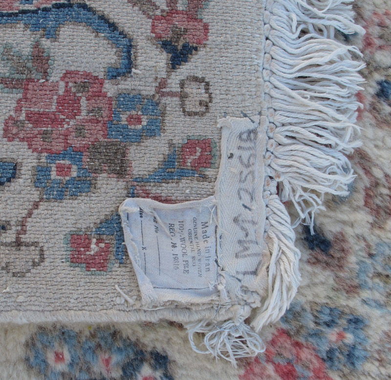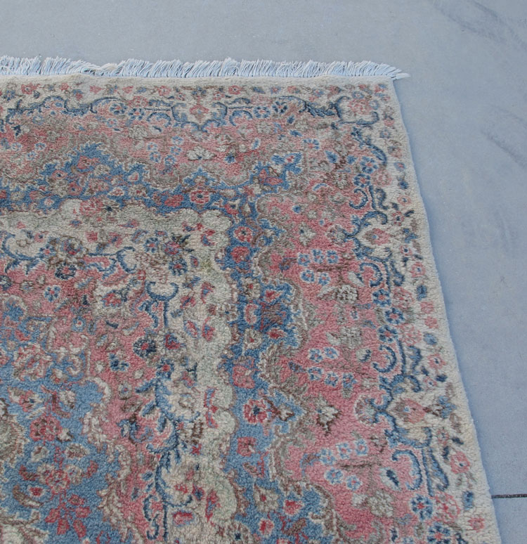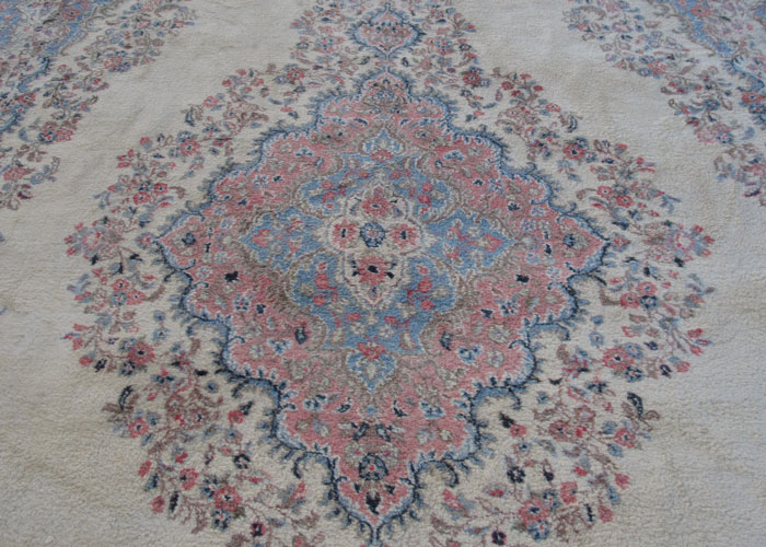 PERSIAN SEMI-ANTIQUE KERMAN HAND KNOTTED WOOL RUG, 11'8'' x 18'4 1/2'': This palace size rug has an open field of ivory with a large diamond shaped central medallion. Sprays of pastel flowers surround the field followed by corners of pastel blue, beige, and pink, finally framed with a broken border using the same colors. There is some color fading but the overall effect of the rug is pleasing.