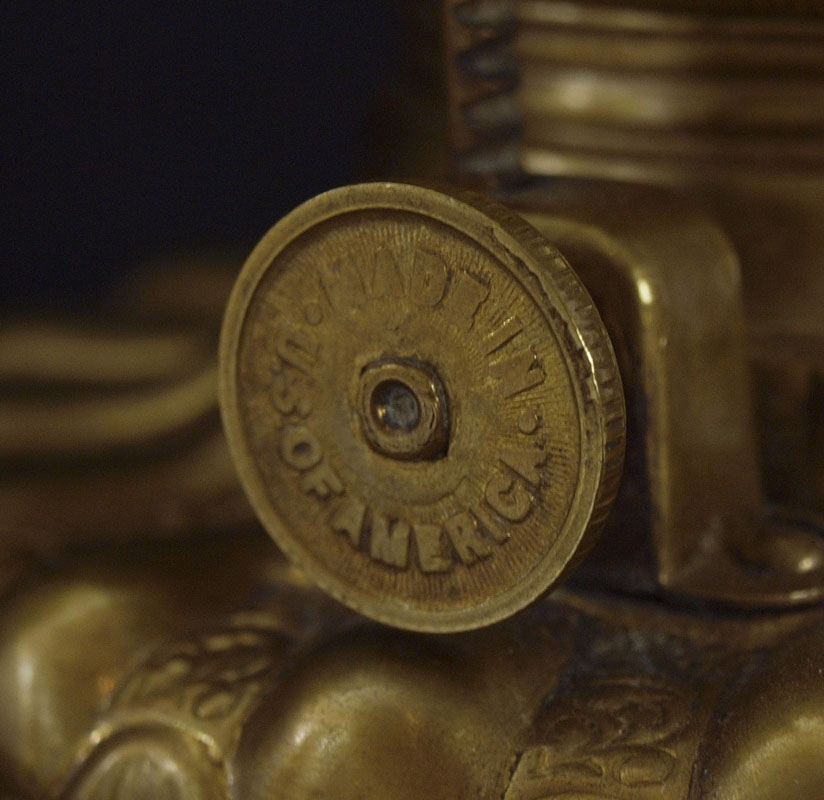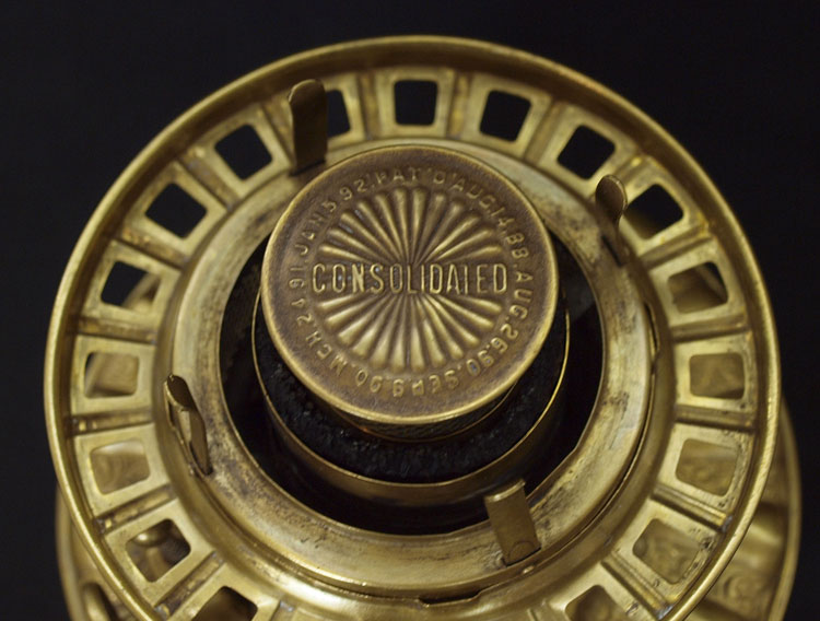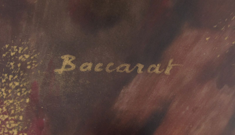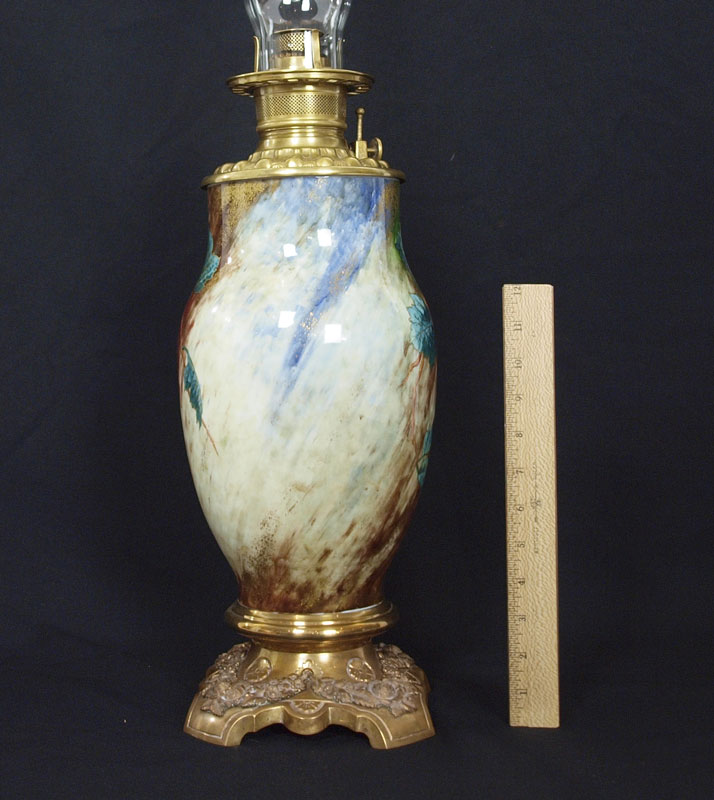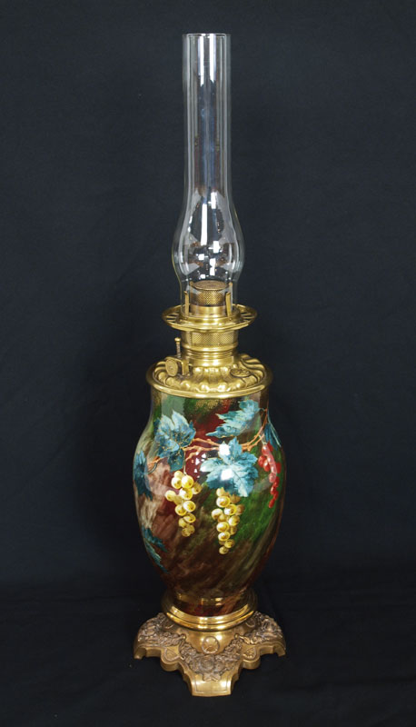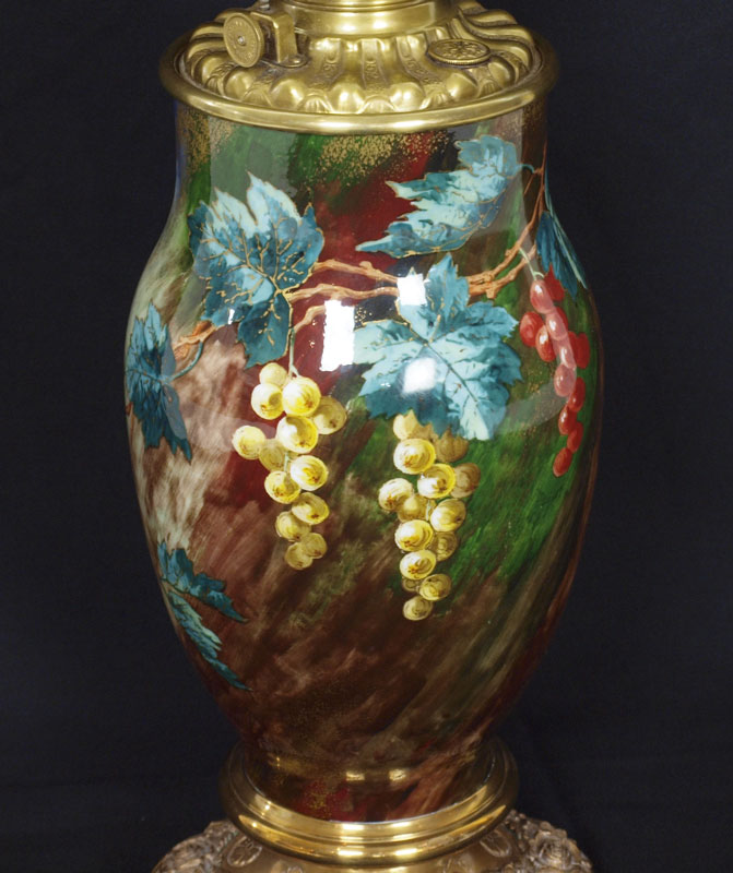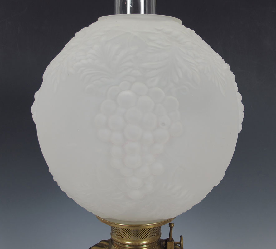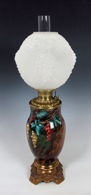 CONSOLIDATED / BACCARAT OIL LAMP: The burner is signed C. Consolidated, the cased glass base in a painted grape design signed Baccarat. The glass globe is a ''blown out'' grape pattern. Approx. 30'' tall.