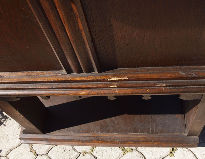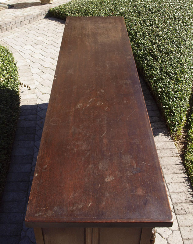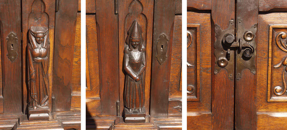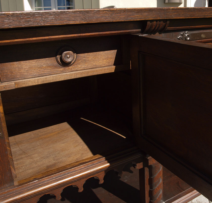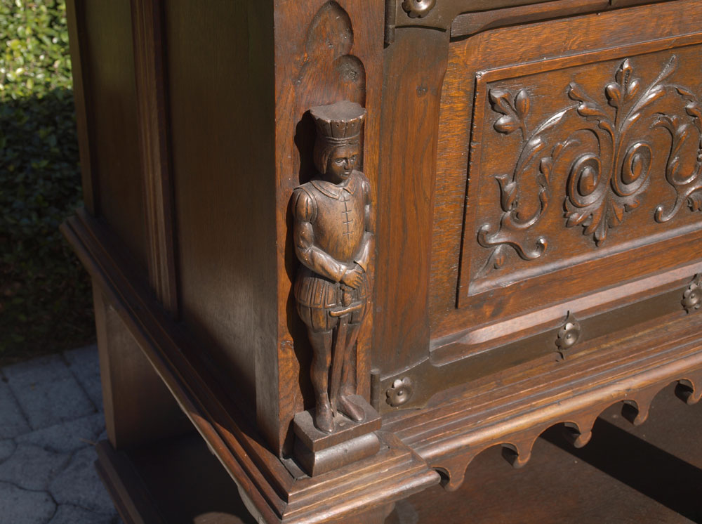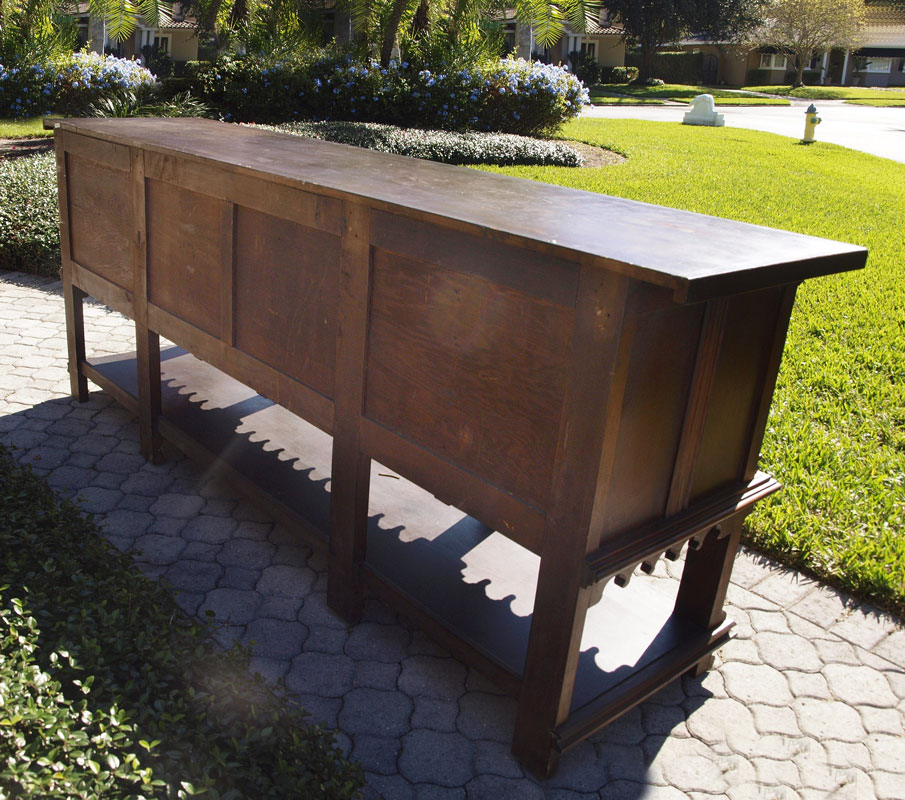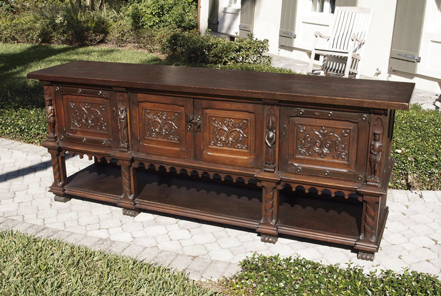 EARLY 1900'S GOTHIC STYLE CARVED SIDEBOARD: Four carved paneled doors with handmade iron hardware. Full bodied carved figures facing front over twisted leg supports and lower shelf. 36 1/2'' h. x 95'' x 23''.