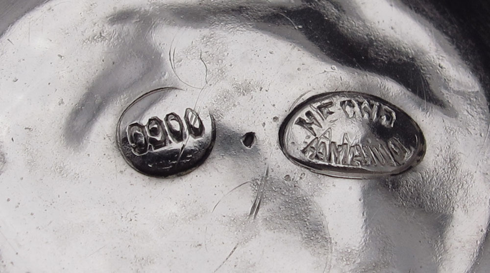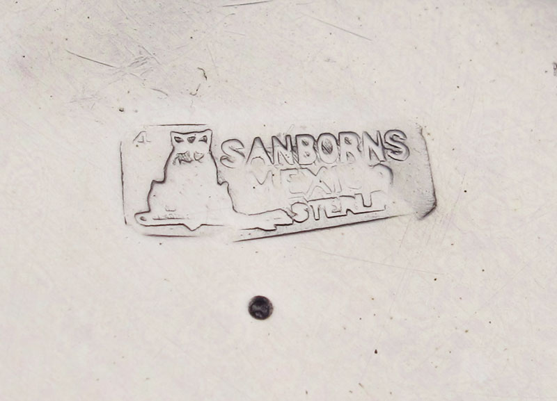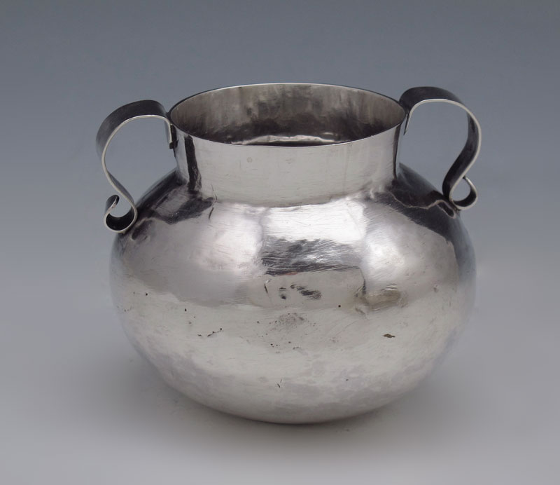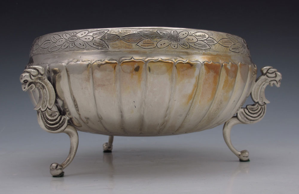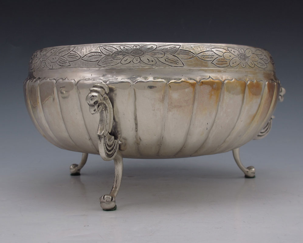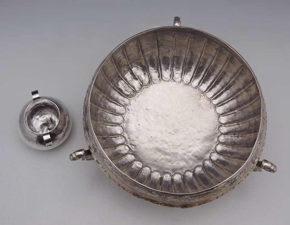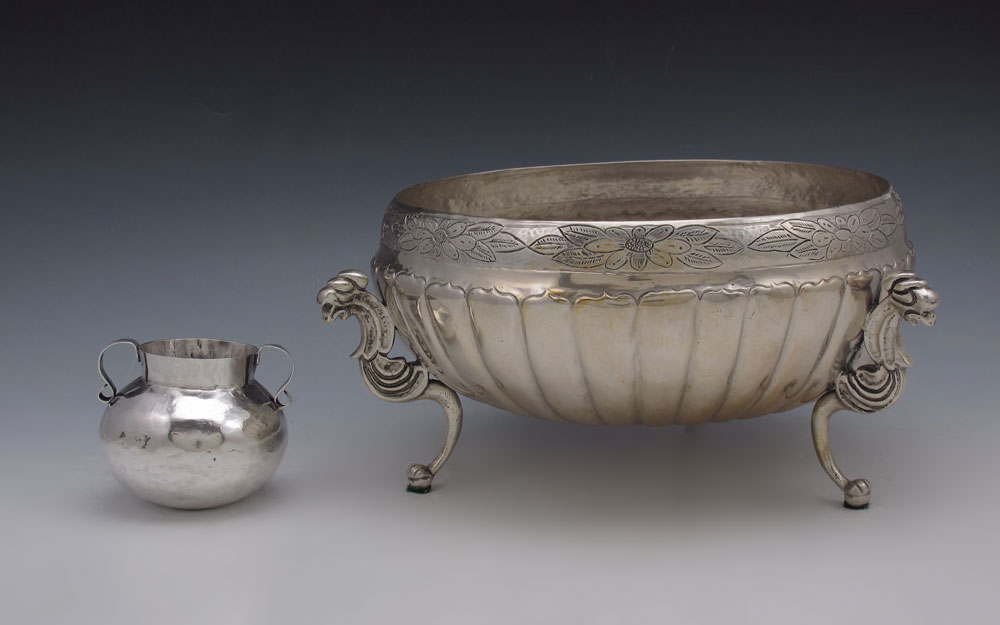 SANBORNS MEXICAN STERLING FOOTED BOWL: Hand hammered bowl with engraved floral rim and 3 figural bird feet. Well marked Sandborns Mexico Sterling on bottom. 4 1/2'' h. x 9 1/4''. Sold with small double handle pot, marked 900 Hecho Mexico, no makers name, 2 1/4'' h x 2 3/4''. Approx. 26.3 troy oz.