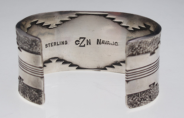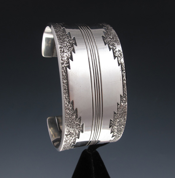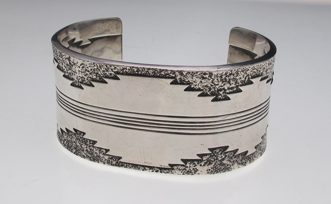 GIBSON NEZ SIGNED NAVAJO STERLING CUFF BRACELET: Fine example of this Navajo smith's exquisite silver work, in a cuff bracelet with stamped, lined, & textured designs. Interior 2 11/16'' x 1 7/8'', opening 1 5/8'', 3.6 troy oz.