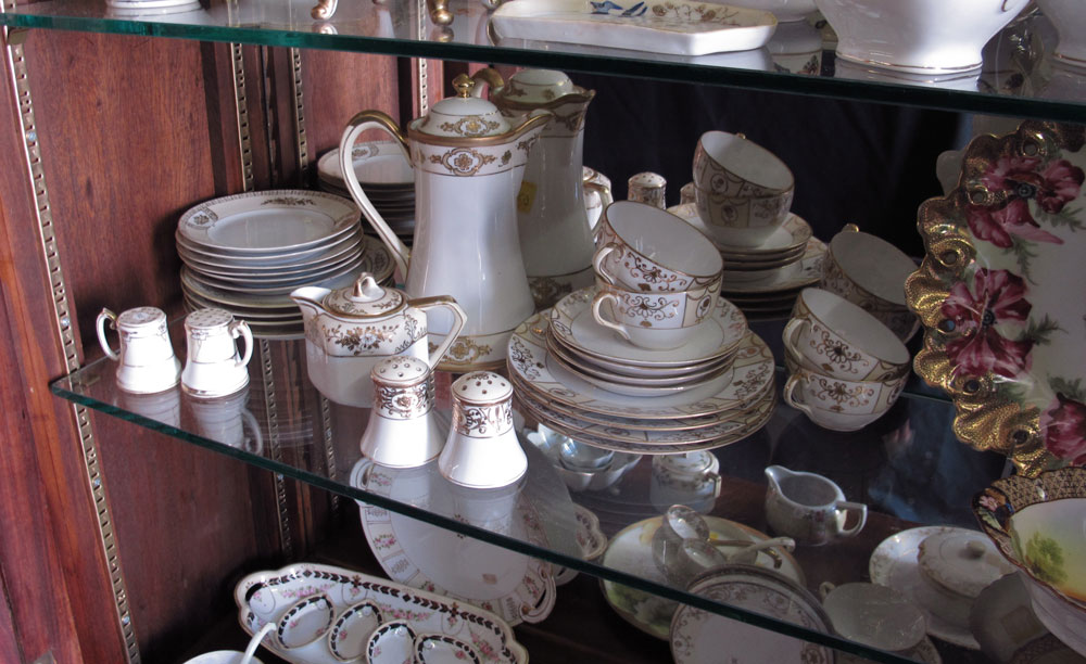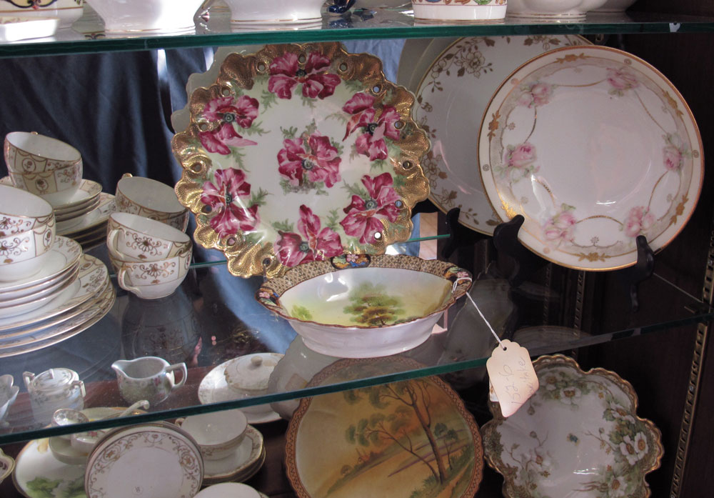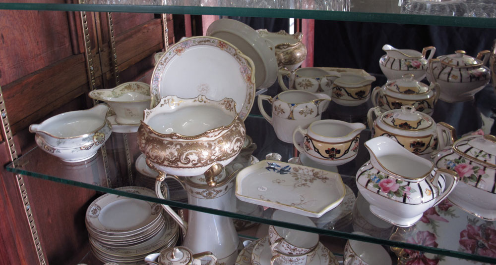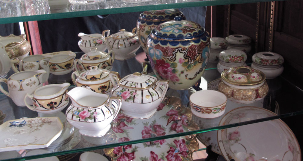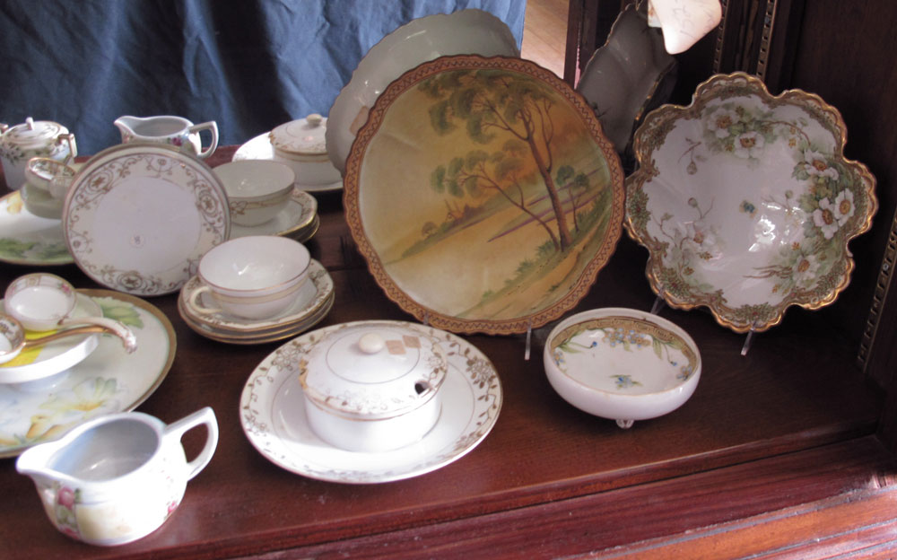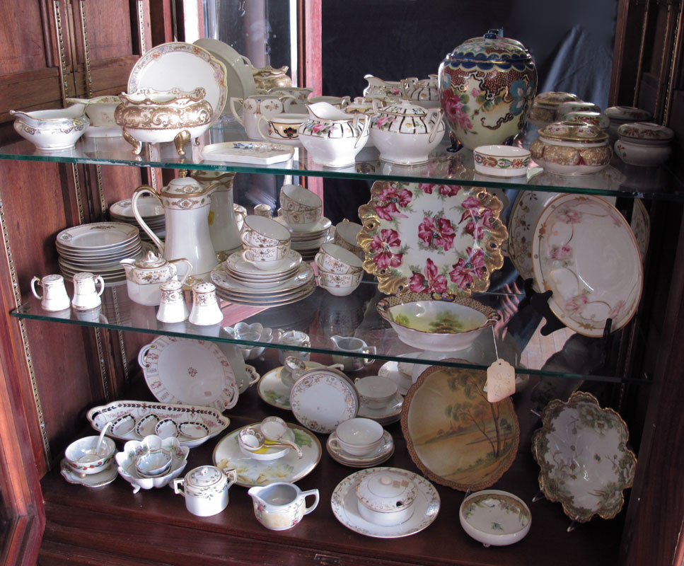 HUGE ESTATE FIND OF NIPPON CHINA: Approx. 75 pieces to include in mixed hand painted designs patterns. Chocolate pot, cups and saucers, plates, large 10'' bowls, celery dish and salts, an 8'' covered jar, hair receivers, cream and sugars, nut bowls. Sent to us directly from storage after years of collecting.