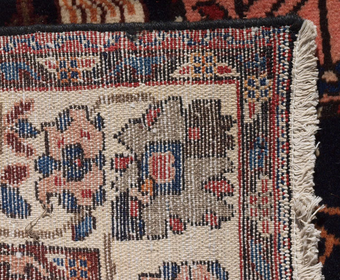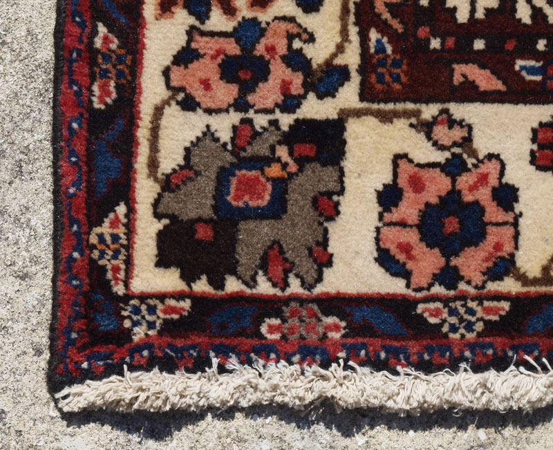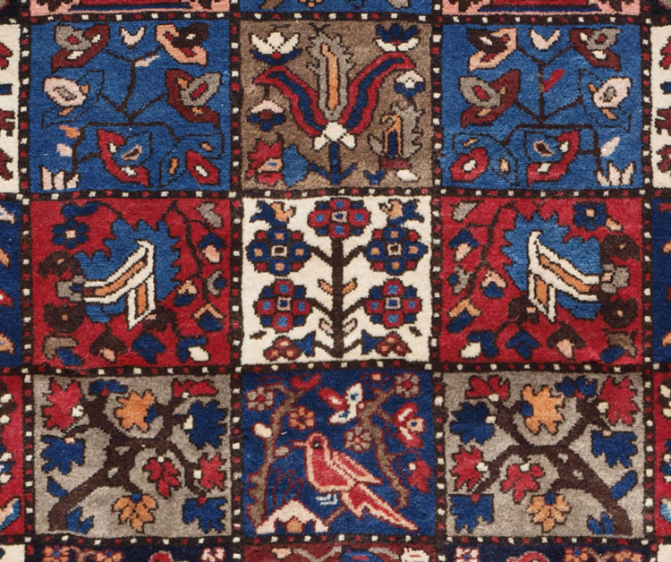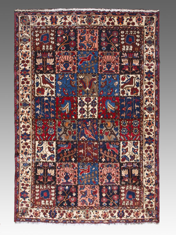 PERSIAN BACHTIARI HAND KNOTTED WOOL RUG, 5'6'' x 7'5'': This very pretty rug has a traditional Bachtiari garden pattern in which the field of the rug is divided into panels that have depictions of different plants and flowers as well as birds, all separated by lines which represent streams of water. Thus the image of a lush garden is represented from a land where verdant landscapes are rare. The red, blues, beiges, and ivory pallette of the rug is also pleasing and the condition is very good.