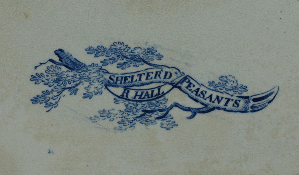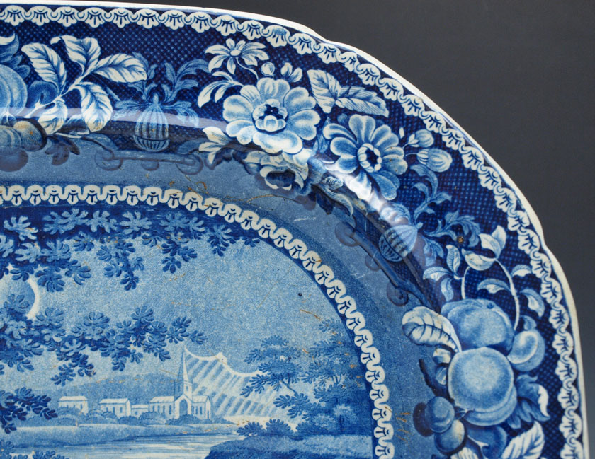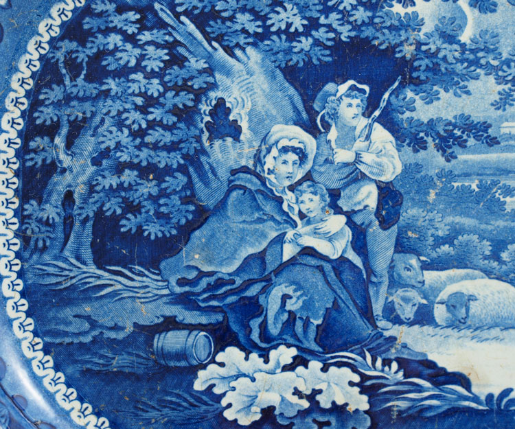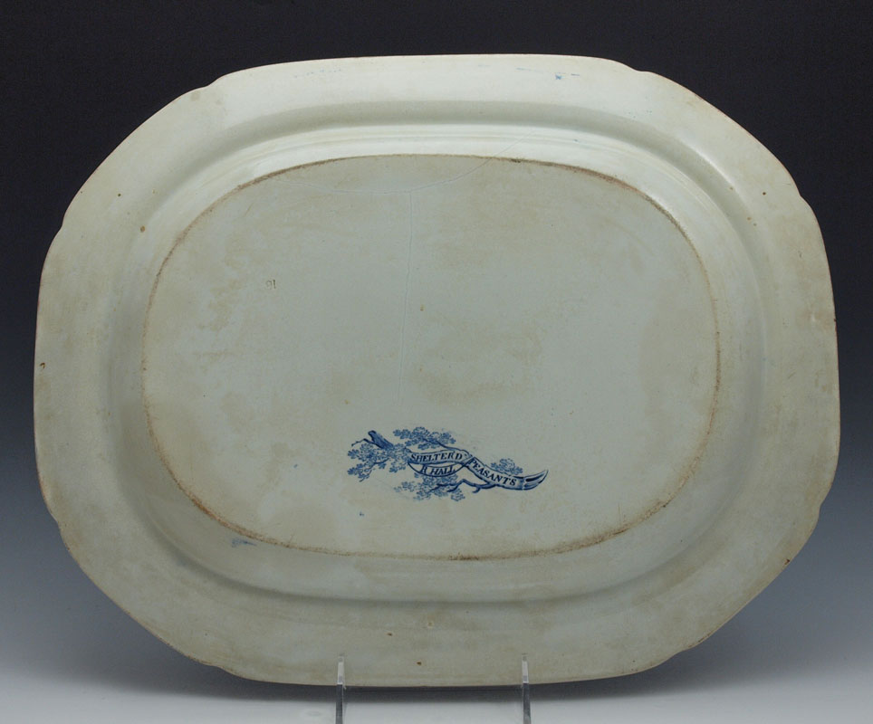 STAFFORDSHIRE SHELTERED PEASANTS BLUE TRANSFERWARE PLATTER: R. Hall, Ca. pre 1841. 17'' X 13 1/4''. Part of the large estate collection of transferware in this months auction.