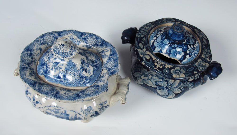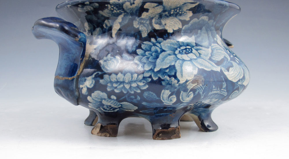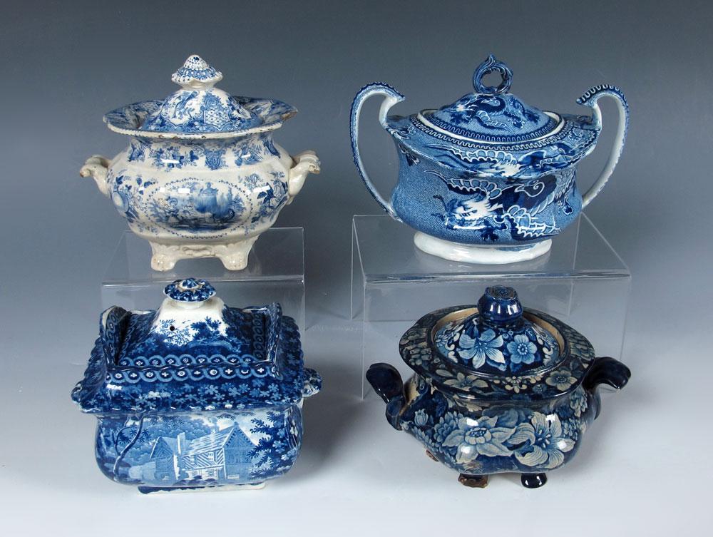 GROUP OF 4 STAFFORDSHIRE BLUE TRANSFERWARE SUGAR BOWLS: 19th C. Romantic Staffordshire sugar bowls in dragon patter, a cottage pattern, a floral and juvenile with peacock pattern. Average approx. 5 1/2''h. x 6''.