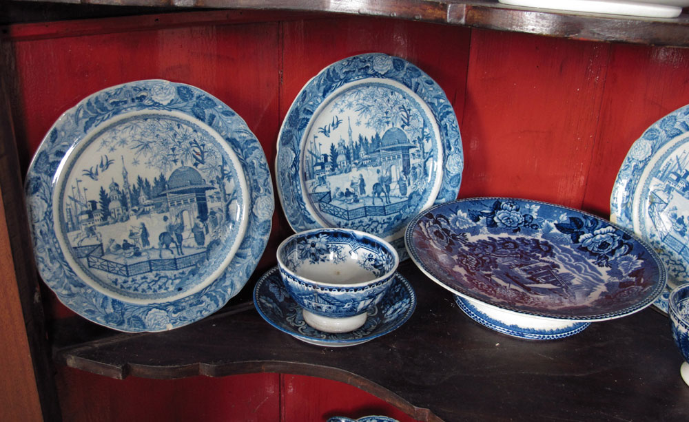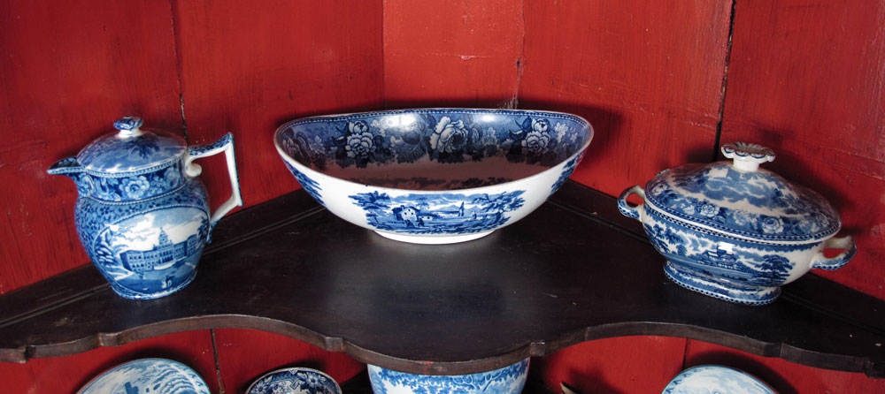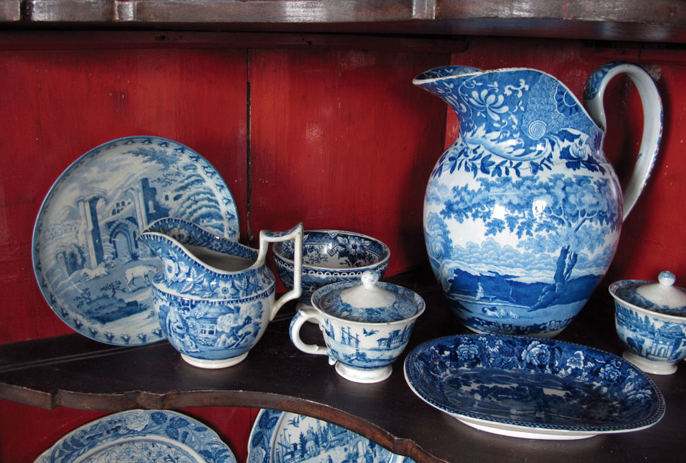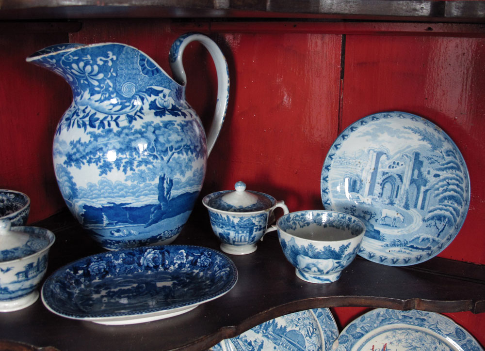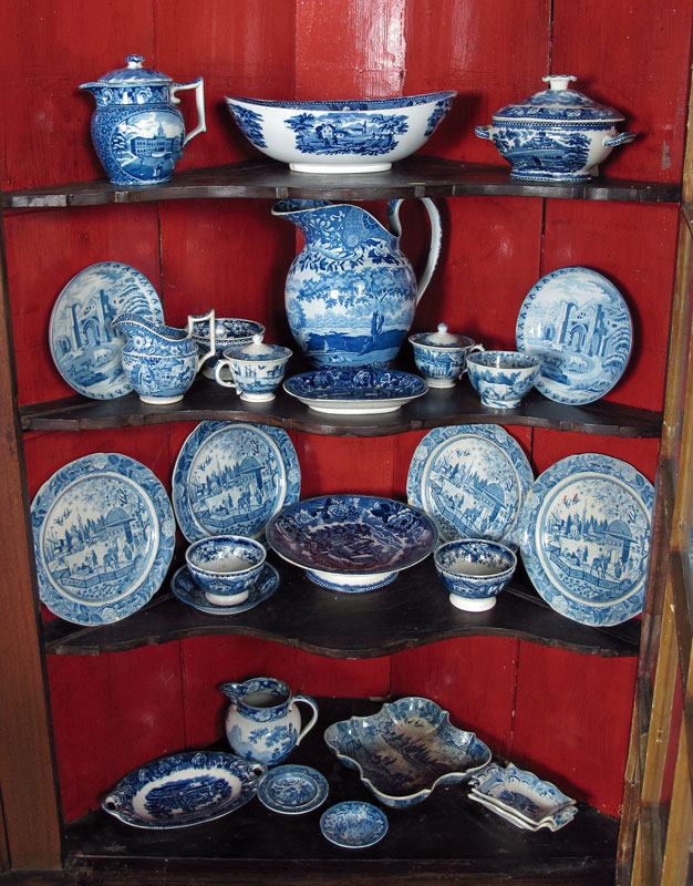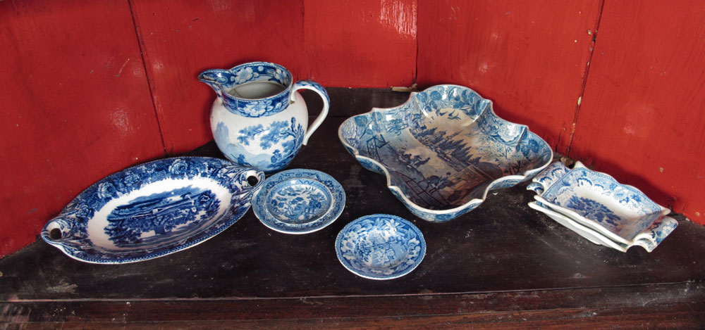 LARGE ESTATE FIND ROMANTIC STAFFORDSHIRE BLUE TRANSFERWARE: 19th C., approx. 26 pieces to include pedestal bowl, handless cups, cup plates, large pitcher, cream pitcher, set of plates. In a variety of patterns. Please note there is a bit of chips and true signs of age.