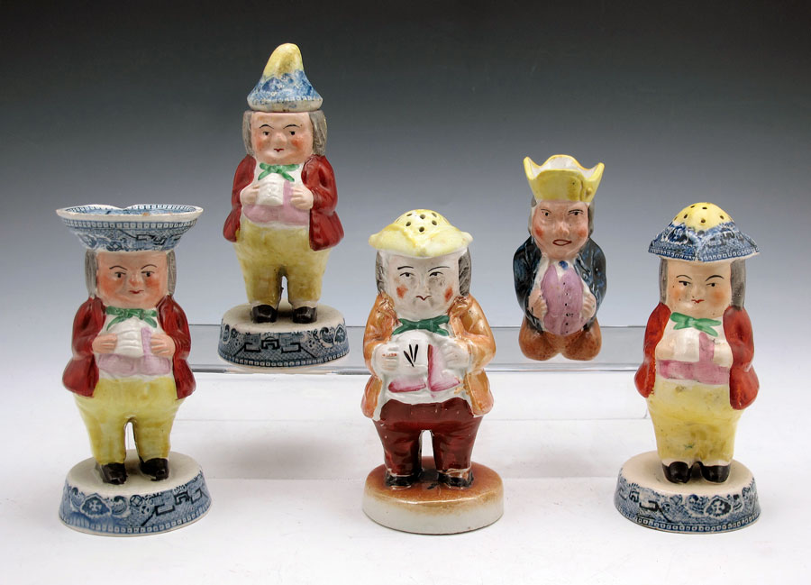19TH C STAFFORDSHIRE TOBY FIGURAL TABLE TOP ACCESSORIES: 5 pieces to include jug, pepperpots and shakers. In worn aged condition. 3 1/2'' - 6'' tall.