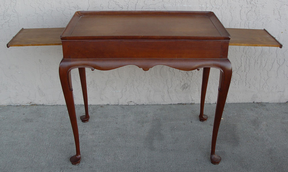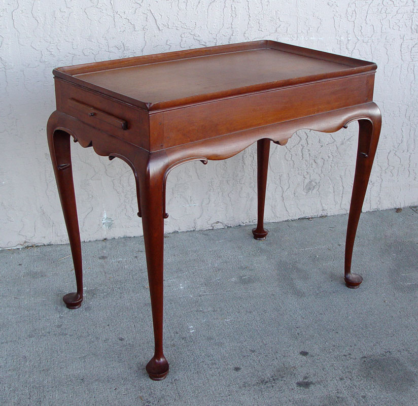 MAHOGANY TEA TABLE: 20th C. Queen Anne Style rectangular tea table with dished top, candle slides; and tall cabriole legs. Approx. Approx. 28 1/2'' x 17 x 28.