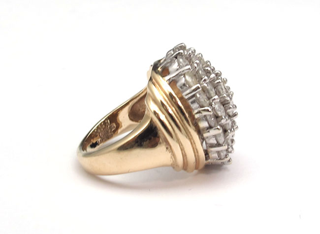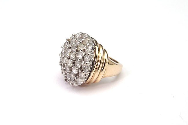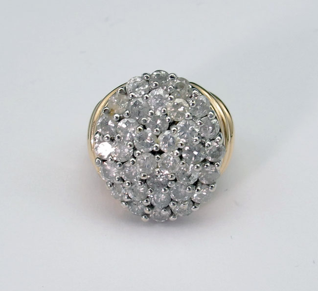 PAVE DIAMOND RING: 14K yellow gold ring contains thirty four round brilliant cut diamonds. Weight: 2.75 Ct. Approx. Rated I1 in clarity and I-J in color. The diamonds are prong set. Weight: 10.3 grams. Size: 3.5