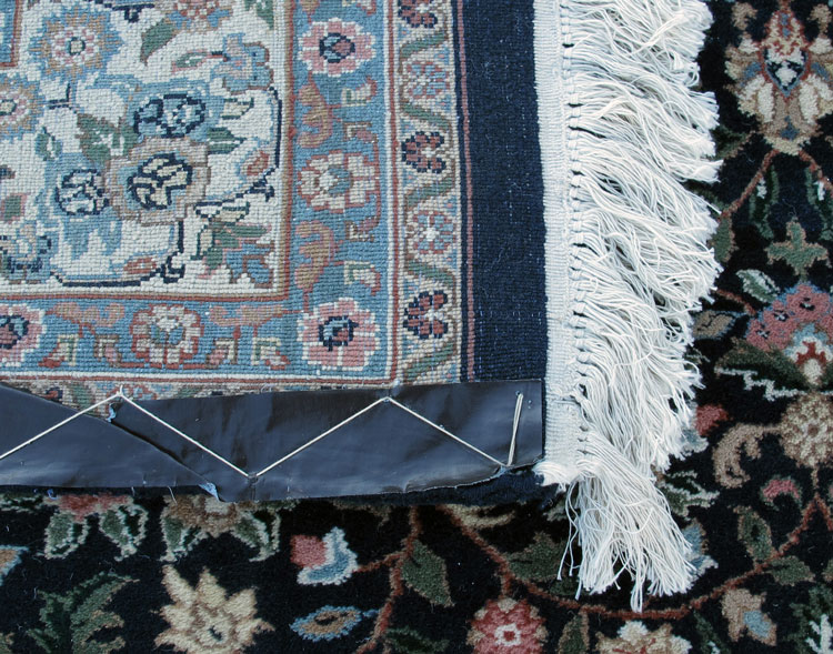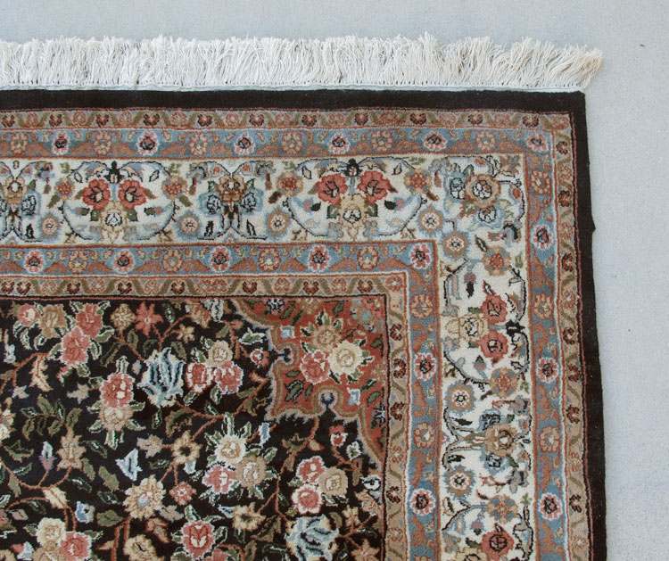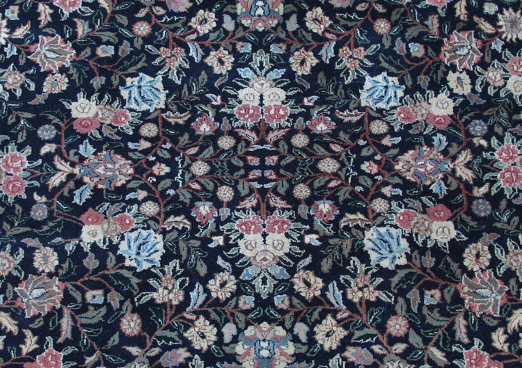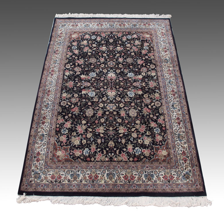INDO-PERSIAN HAND KNOTTED WOOL RUG, 5'10'' x 9': This rug has an overall pattern of realistically drawn clusters of roses linked by vines on a midnight blue field. It is like an antique Veramin (Persian city rug), but is a modern rug. The whole design is very pleasing with the field being bordered by a white ground main border edged by two guard borders on each side. The colors used throughout the rug are complimentary to each other so the overall effect makes for a beautiful rug. There are a few minor stains that are not highly visible. Otherwise, the condition is good.